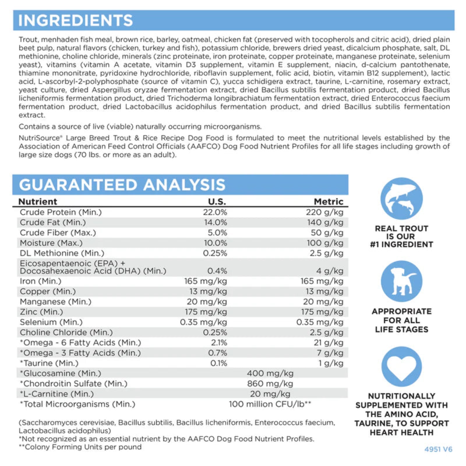 - As a member of our grain inclusive series of dog foods, NutriSource® Large Breed Trout & Rice Recipe is formulated to meet AAFCO guidelines for all life stages.