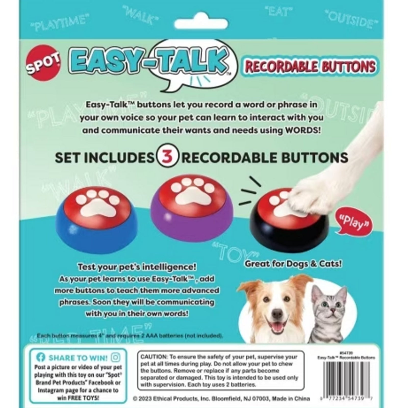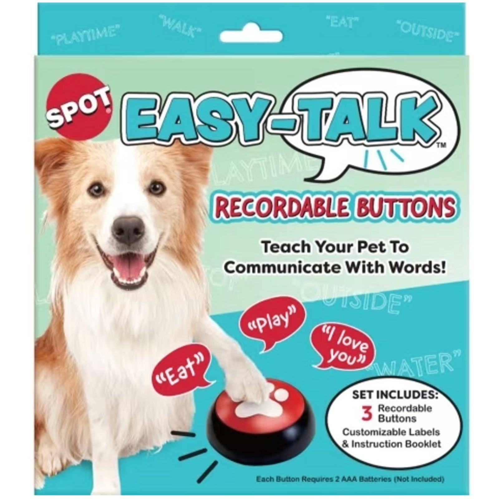 The Spot Easy Talk Recordable Buttons a great way to connect and communicate with your pup! Record a word or phrase in your own voice so your pet can learn to interact with you and communicate their wants and needs using words. Set includes 3 recordable buttons.