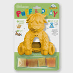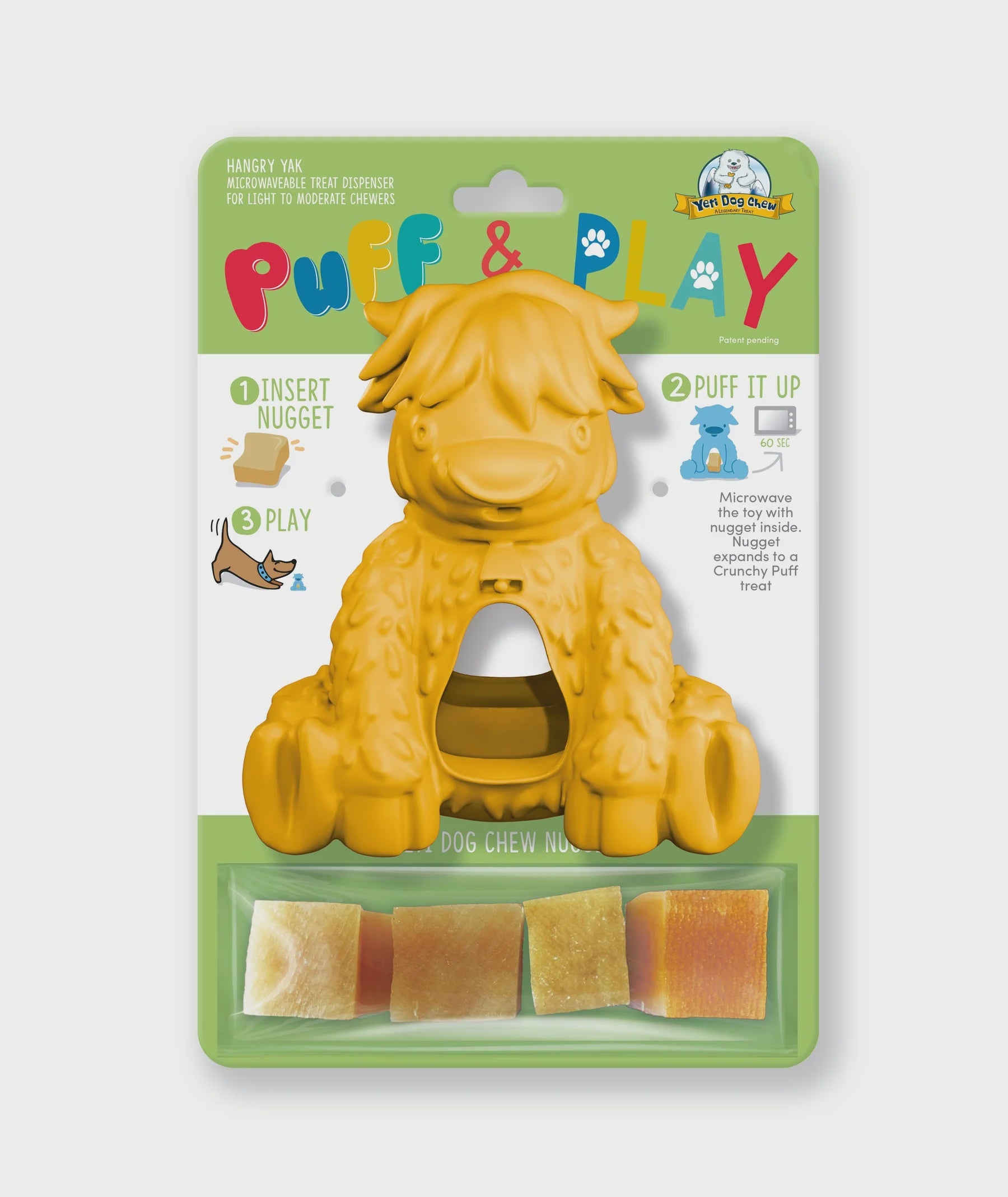Yeti Puff and Play Toy is a long lasting chew treat dispensing toy for light and moderate chewers. It comes in three different colors: Pink, Green and Blue. It is microwave and dishwasher safe and works well with all natural Yeti Nuggets.