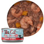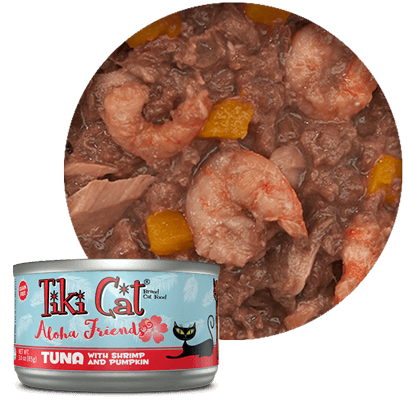 Flaked tuna, tuna broth, pumpkin, shrimp, sunflower seed oil, calcium lactate, tricalcium phosphate, choline chloride, taurine, vitamin E supplement, zinc sulfate, thiamine mononitrate (vitamin B1), niacin (vitamin B3), calcium pantothenate, manganese sulfate, vitamin A supplement, potassium iodide, ferrous sulfate, riboflavin supplement (vitamin B2), pyridoxine hydrochloride (vitamin B6), copper sulfate, folic acid, vitamin B12 supplement.