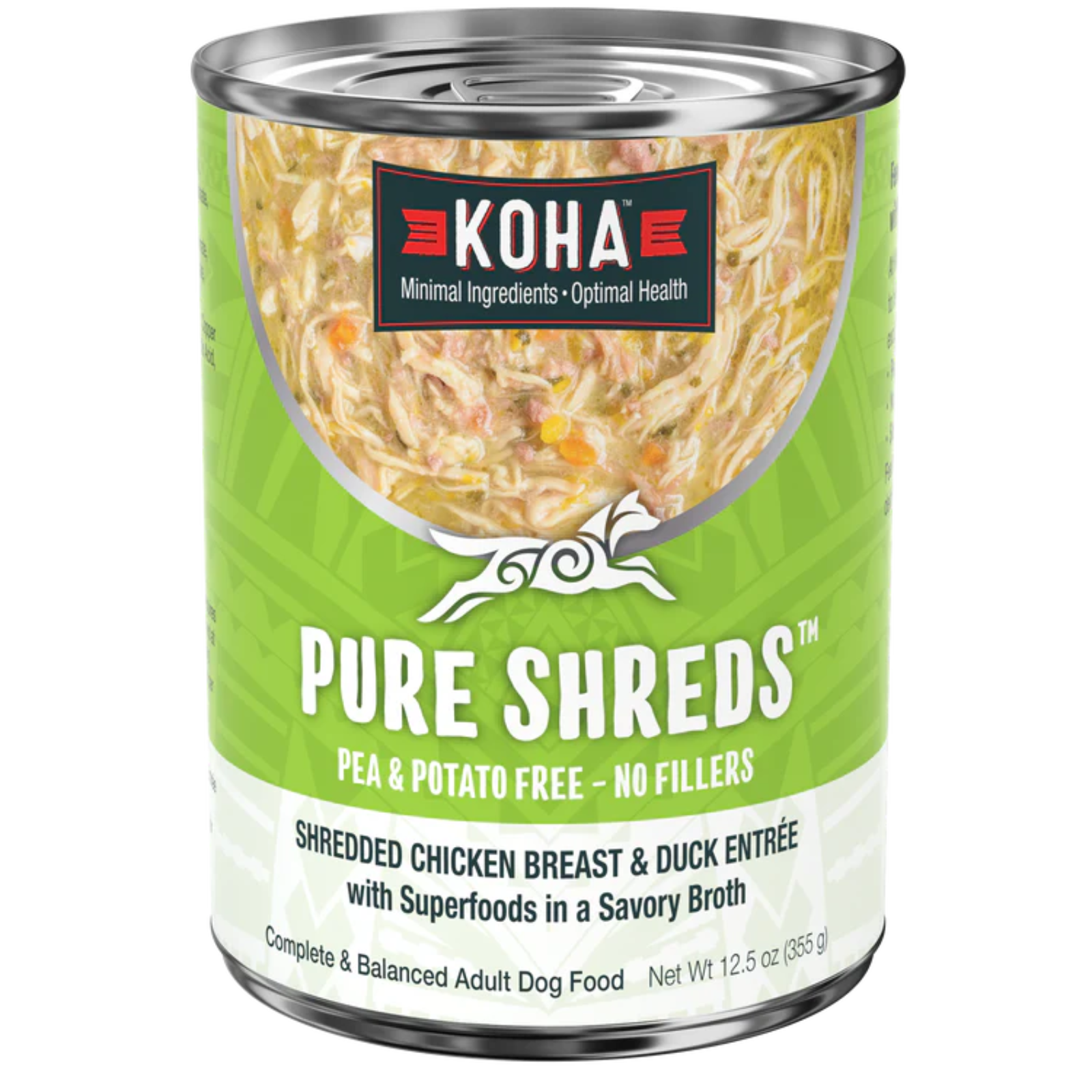 KOHA Pure Shreds are delicious shredded chicken breast recipes in a savory broth. Dogs go crazy for the shredded texture and the tasty superfood blend of pumpkin, carrots, & spinach. This low fat entrée is an excellent choice for weight control. Our Pure Shreds Shredded Chicken Breast & Beef Entrée does not contain any unnecessary fillers or artificial preservatives or carb-loaded fillers like peas, potatoes, and grains that can lead to digestive issues.