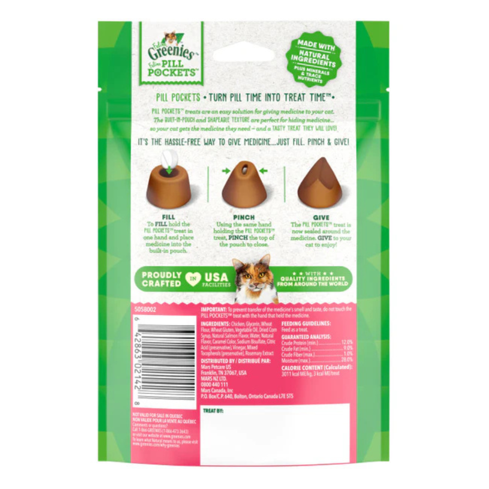 FELINE GREENIES PILL POCKETS Treats have built-in pouches to easily hide tablets or capsules and ensure your cat takes their medication. These all-natural treats are a healthier alternative to using human foods, because they have fewer calories and less fat and sodium. Plus, they're made with real chicken and natural salmon proteins for a great taste. Make medicine-giving more enjoyable for both you and your cat.