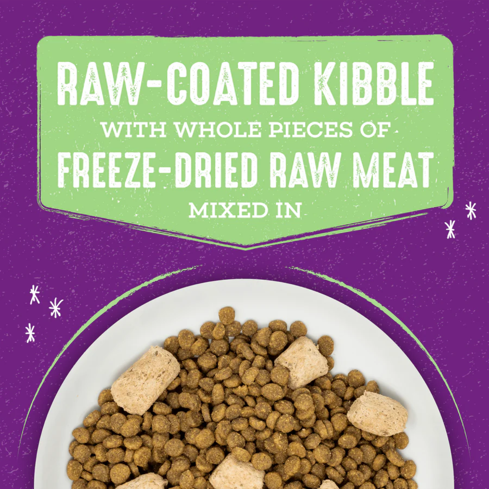 Chicken, chicken meal, lentils, peas, chicken fat (preserved with mixed tocopherols), turkey, natural chicken flavor, chicken liver, duck, chicken gizzard, fenugreek seed, salmon oil, sun-cured alfalfa, blueberries, dandelion greens, taurine, choline chloride, tocopherols (preservative), yuca schidigera extract, thyme, rosemary, sage, cranberries, zinc proteinate, iron proteinate, copper proteinate, magnesium proteinate, manganese proteinate, sodium selenite, vitamin E supplement, calcium iodate, thiamine mononitrate, niacin supplement, d-calcium pantothenate, riboflavin supplement, vitamin A supplement, vitamin D3 supplement, vitamin B12 supplement, pyridoxine hydrochloride, biotin, folic acid, salt, dried Pediococcus acidilactici fermentation product, dried Lactobacillus aciophilus fermentation product, dried Bifidobacterium longum fermentation product, dried Bacillus coagulans fermentation product.