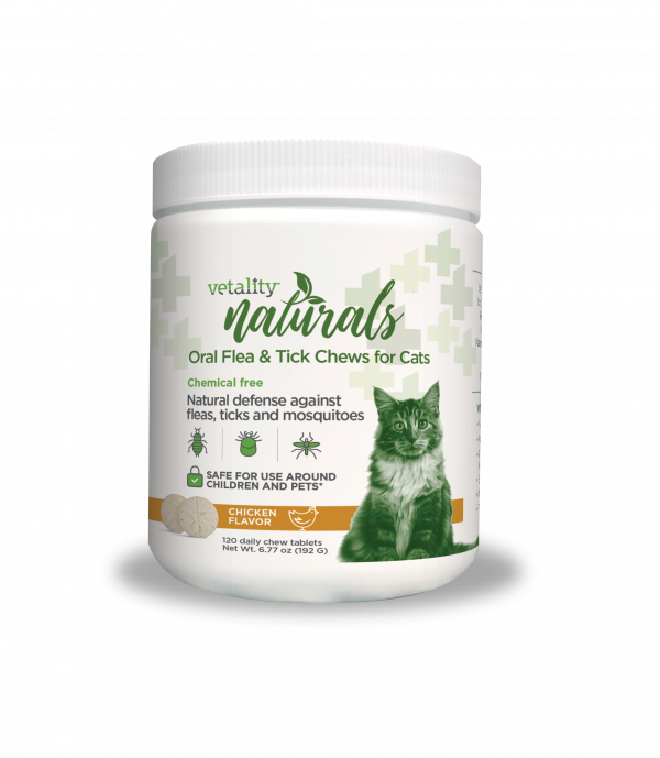 Vetality Natural’s Oral Flea Chews for Cats is a natural oral chew flavored with real chicken flavor that naturally repels fleas, ticks & mosquitoes before they bite. Your cat will crave the chicken flavored chews, wagging their tail in anticipation for their daily pest prevention treat.