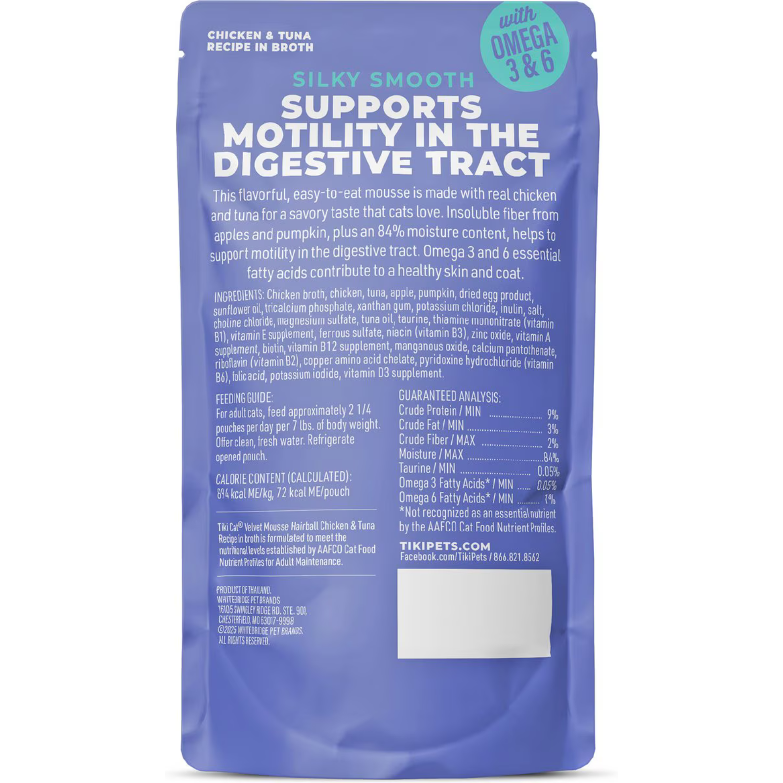 Supports Motility in the Digestive Tract. Tiki Cat(R) Velvet Mousse Hairball Recipe is a flavorful, easy-to-eat mousse that is complete and balanced and made with real chicken and tuna for a savory taste cats love. A gentle blend of fiber from apples and pumpkin, plus an 84% moisture content, helps to support motility in the digestive tract. Omega 3 and 6 essential fatty acids contribute to a healthy skin and coat.