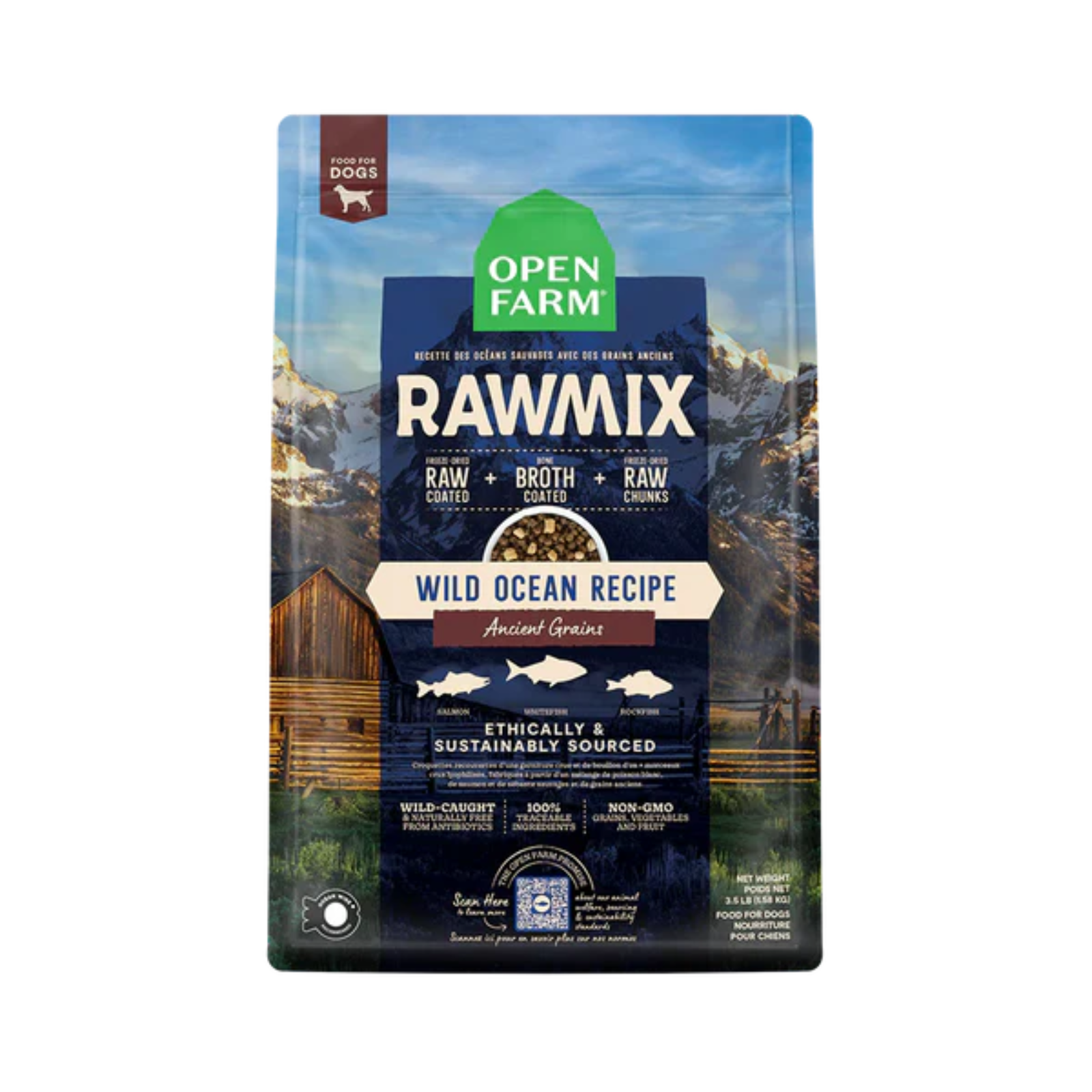 Ocean Whitefish, Ocean Menhaden Fish Meal, Peas, Ocean Whitefish Meal, Lentils, Coconut Oil, Salmon, Ocean Rockfish, Chickpeas, Sunflower Oil (Preserved with mixed tocopherols), Natural Flavor, Pumpkin, Cranberries, Apples, Dandelion Greens, Salt, Choline Chloride, Magnesium Sulfate, Potatoes, Tapioca, Niacin Supplement, Vitamin A, Supplement, Thiamine Mononitrate (B1), Calcium Pantothenate, Vitamin D3, Supplement, Pyridoxine Hydrochloride, Riboflavin Supplement (B2), Vitamin B12 Supplement, Folic Acid, Biotin, Dried Chicory Root, Taurine, Zinc Proteinate, Iron Proteinate, Copper Proteinate, Manganese Proteinate, Sodium Selenite, Calcium Iodate, Organic Butternut Squash, Organic Carrots, Organic Blueberries, Montmorillonite Clay, Tricalcium Phosphate, Miscanthus Grass, Fish Bone Broth, Flaxseed, Dried Yucca Schidigera, Organic Spinach, Organic Kale, Organic Apple Cider Vinegar, Organic Pumpkin Seeds, Organic Sunflower Seeds, Rosemary Extract