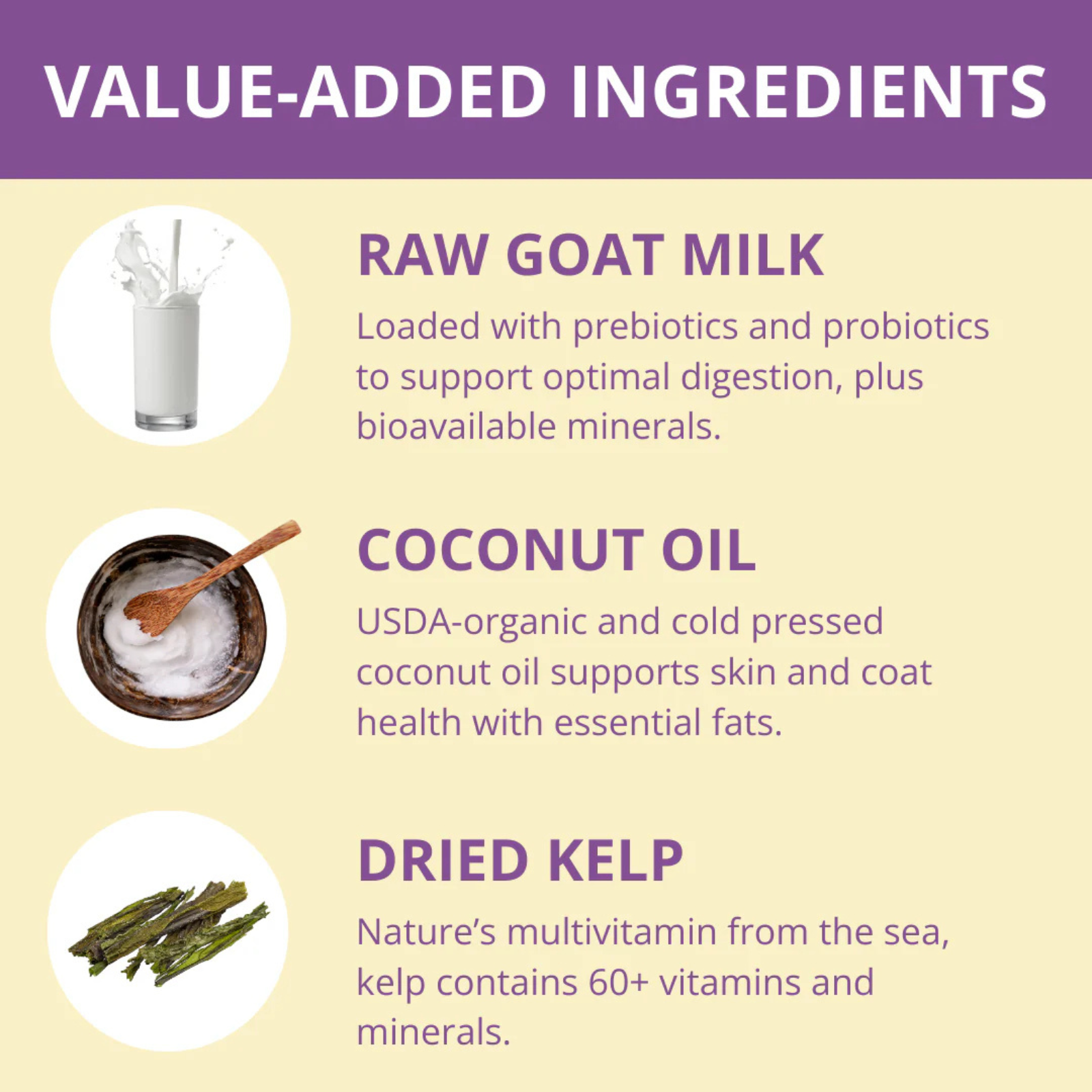 Chicken, Chicken Liver, Chicken Heart, Chicken Necks, Raw Goat Milk, Flaxseed, Kelp, Salmon Oil, Taurine, Inulin, Organic Coconut Oil, Chia Seeds, Sesame Seeds, Eggshell Membrane