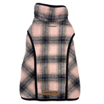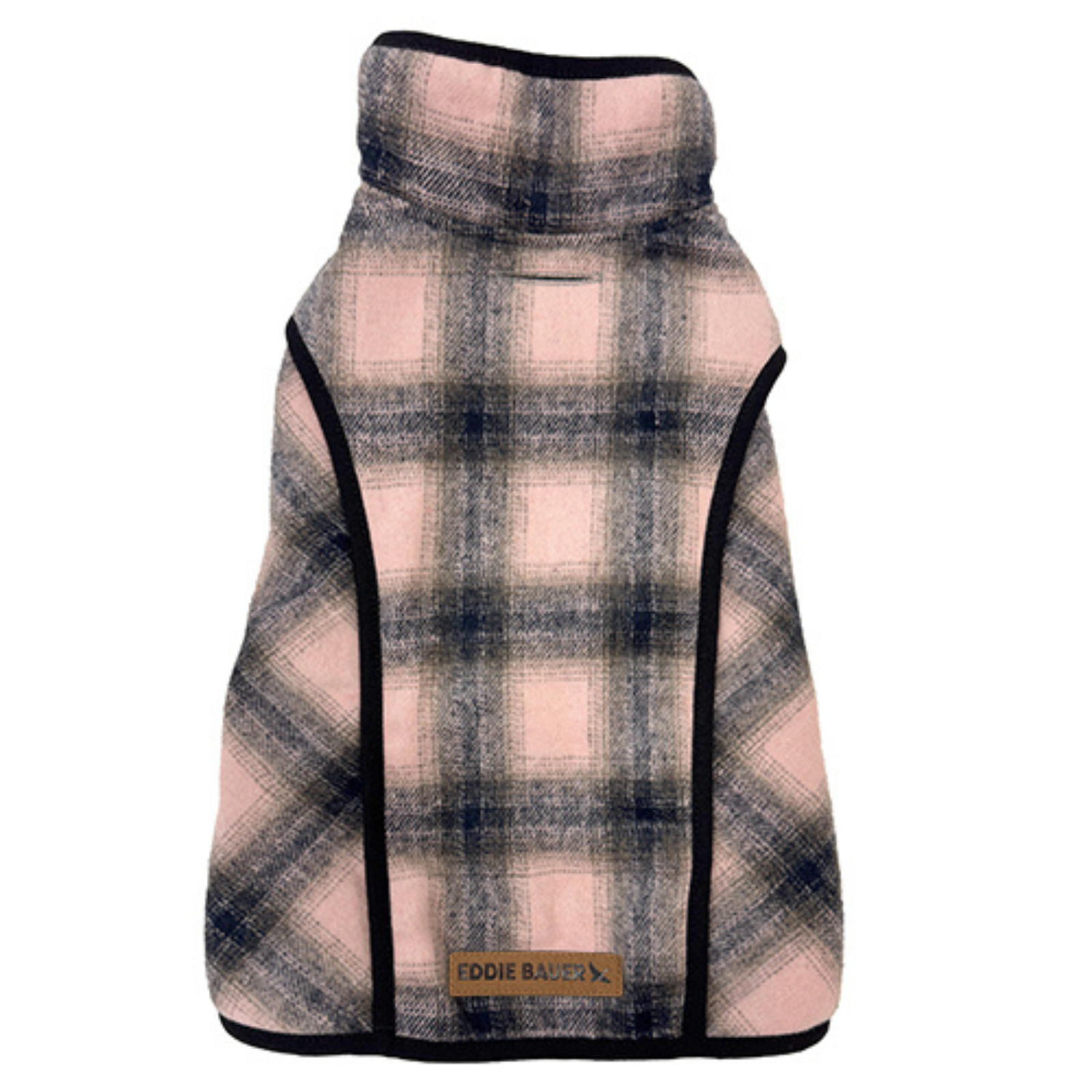 Brushed check sporty jacket with poly fill, fleece lining, standup collar, and adjustable hook-and-loop straps at the neck and belly ensure a secure fit. Faux suede Eddie Bauer label and leash opening. 100% polyester.