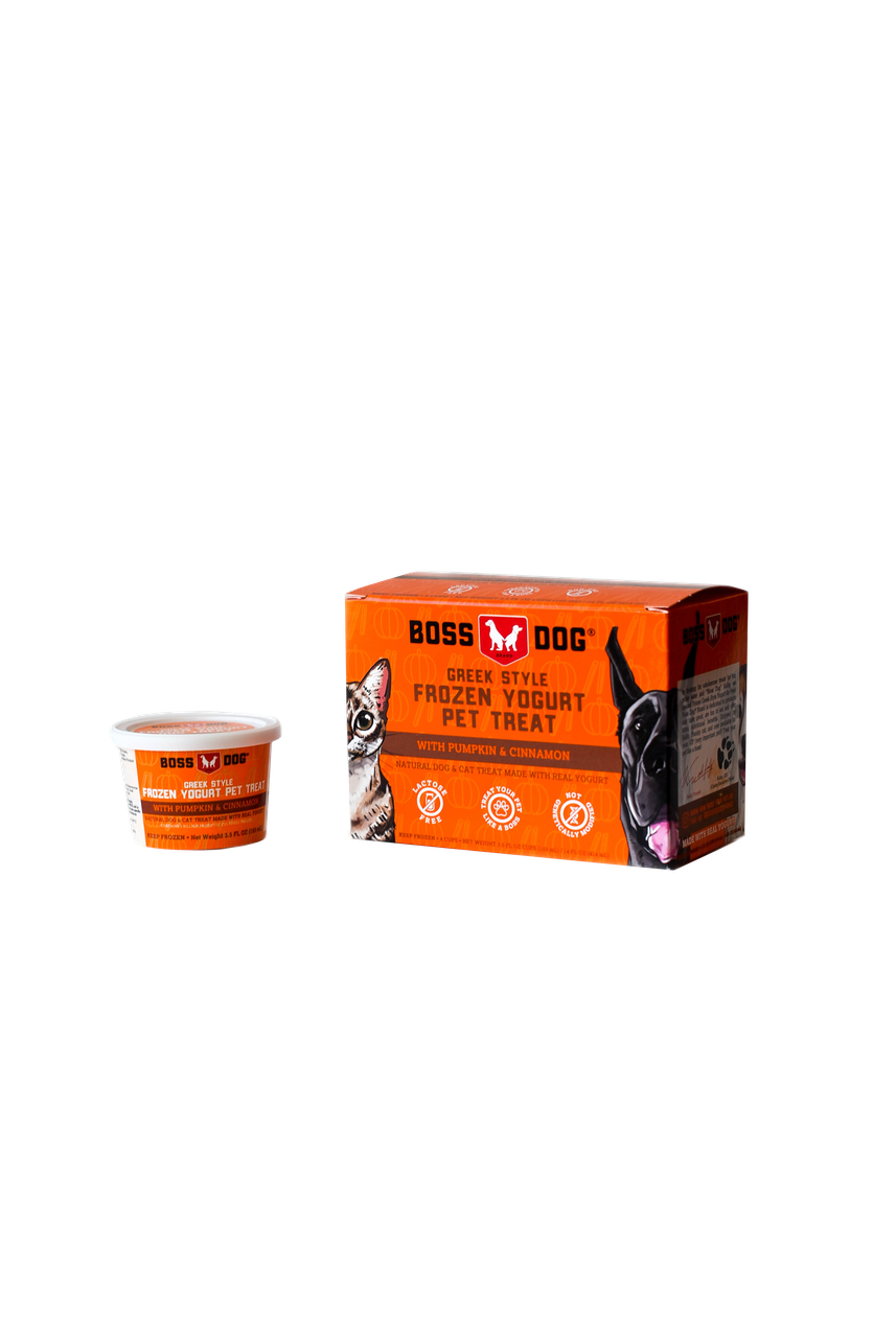 The newest addition to the Boss Dog Brand line up– Greek Style Frozen Yogurt Dog Treats with the delicious combination of pumpkin & cinnamon. These frozen yogurt treats are 100% human grade- ensuring the highest quality ingredients make it into every single cup. All of this great taste also has the added benefit of over 3 billion probiotic cultures per cup as well as prebiotics!