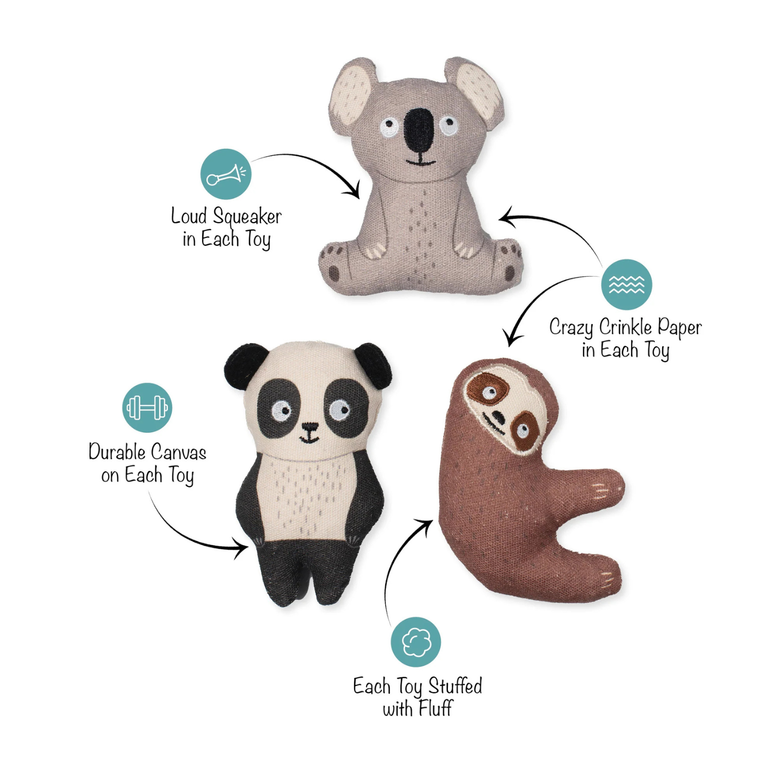 Our “Cuddle Buddies" 3 piece mini toy set is the perfect playdate for your pup. Featuring durable cotton canvas, loud squeakers, crazy crinkle paper, and printed with water based and non-toxic ink, these toys were designed with interactive play in mind and a look that complements modern home décor. Whether you squeak, crinkle, or toss them, your pup will enjoy some koala-ty playtime.