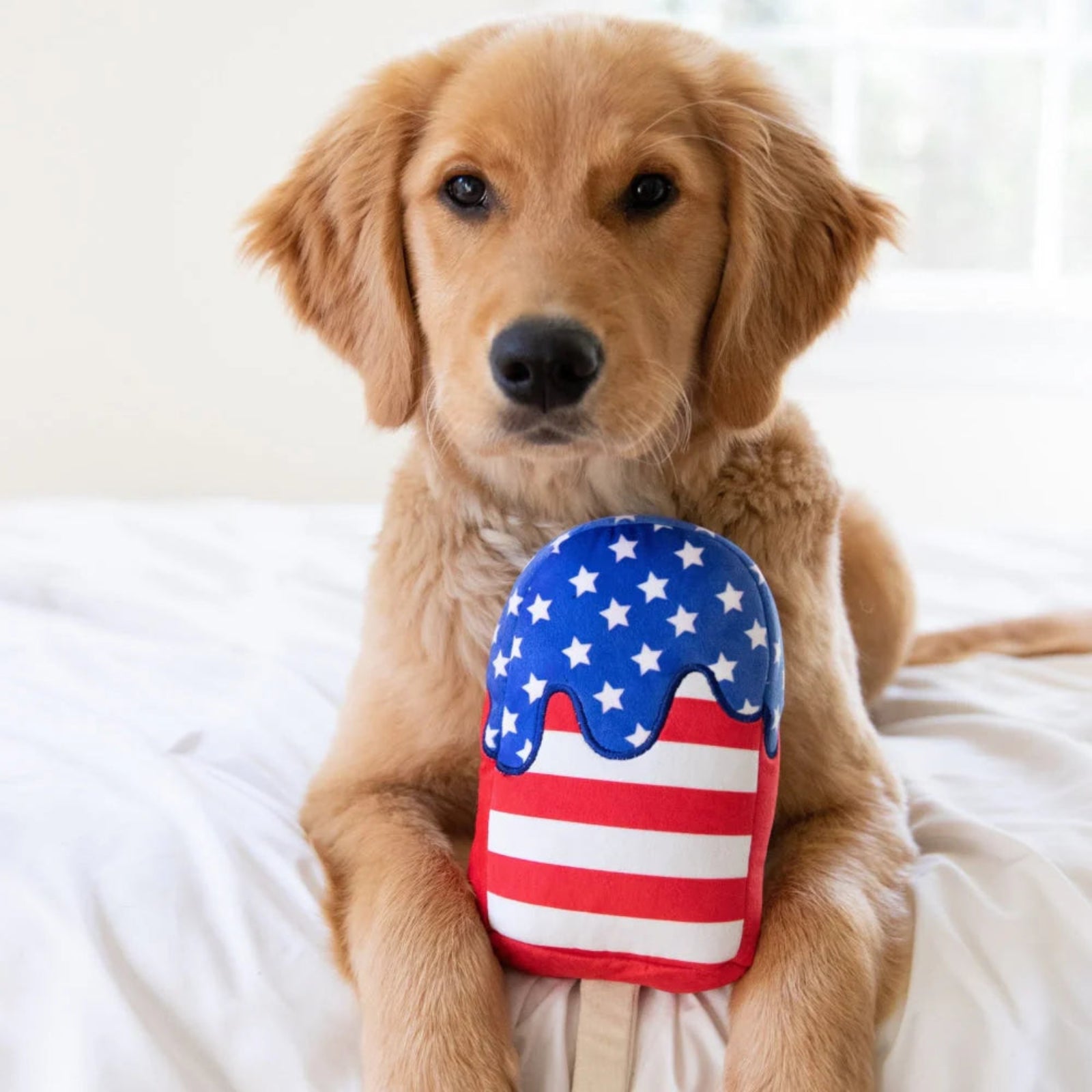 Celebrate the star-spangled banner with your furry friend and this Star Pop plush toy! It's a playful salute to those red, white, and blue days, and it's perfect for a patriotic game of fetch or a cozy cuddle after the fireworks. Show your pup's American spirit with every squeak and toss!