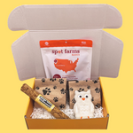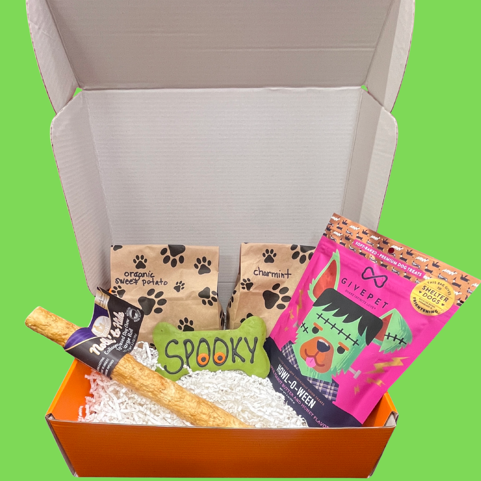 Each box will deliver an assortment of 2 Types of Healthy Bulk Treats from our Bulk Bar (a Half Pound Each), 1 Packaged Treat, 1 Chew, and 1 Seasonal Iced Cookie from our Barkery Case!