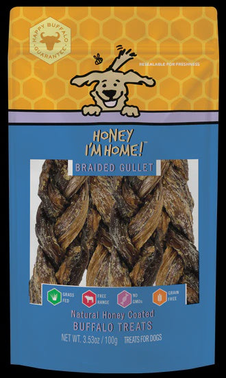 Give your barking bestie a treat they'll crave with our Honey I'm Home 6" Braided Gullet. They're high in protein and devoid of grains and fillers. In addition to preventing buildup of tartar while your dogs chew, these healthy dog treats are also a natural source of glucosamine, which is an amino acid shown to aid in joint health. These gullet chews will help your paw-some pal exercise their jaws and clean their teeth, all while keeping them pleasantly entertained!