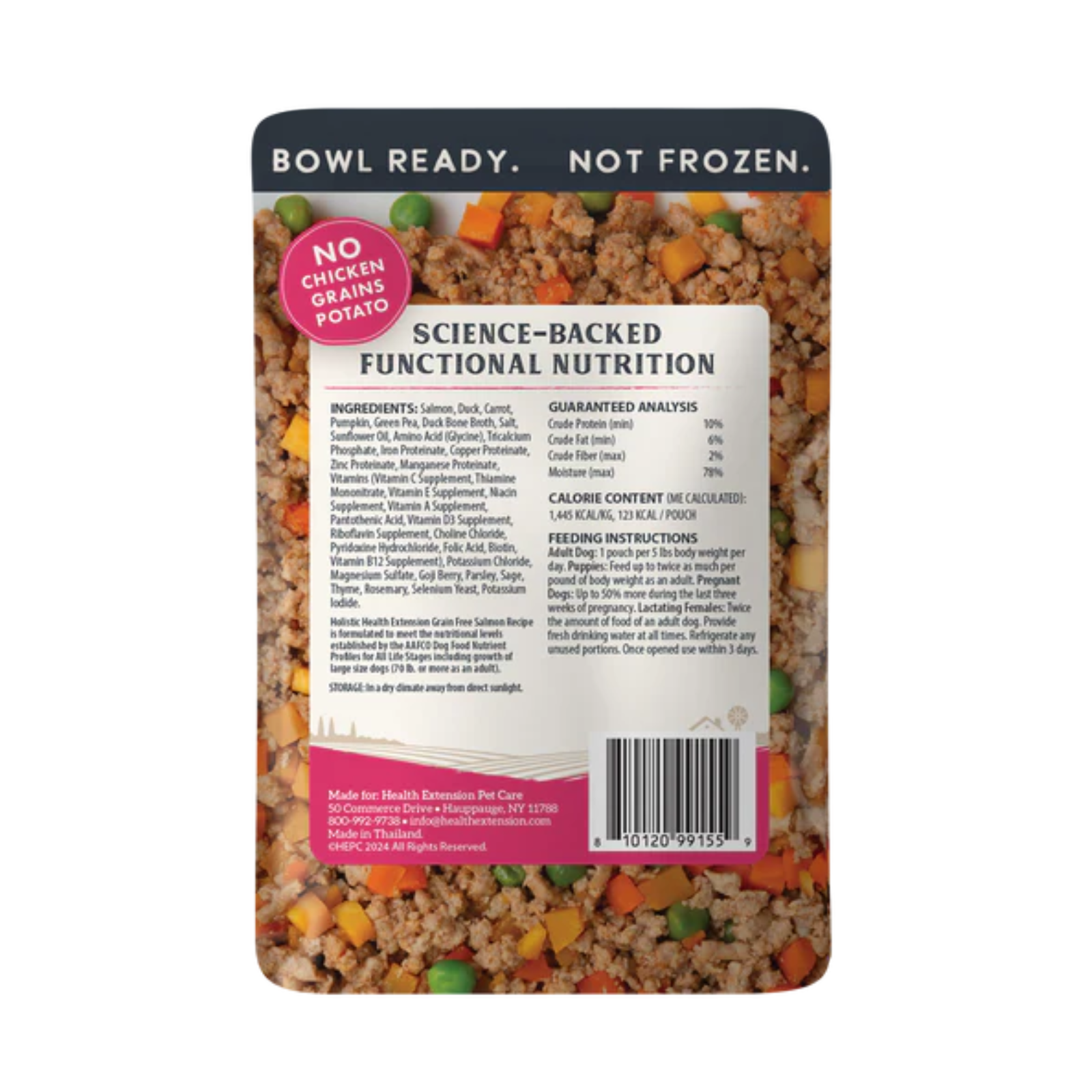 Salmon, Duck, Carrot, Pumpkin, Green Pea, Duck Bone Broth, Salt, Sunflower Oil, Amino Acid, Tricalcium Phosphate, Iron Proteinate, Copper Proteinate, Zinc Proteinate, Manganese Proteinate, Vitamins (Vitamin C Supplement, Thiamine Mononitrate, Vitamin E Supplement, Niacin Supplement, Vitamin A Supplement, Pantothenic Acid, Vitamin D3 Supplement, Riboflavin Supplement, Choline Chloride, Pyridoxin Hydrochloride, Folic Acid, Biotin, Vitamin B12 Supplement), Potassium Chloride, Magnesium Sulfate, Goji Berry, Parsley, Sage, Thyme, Rosemary.