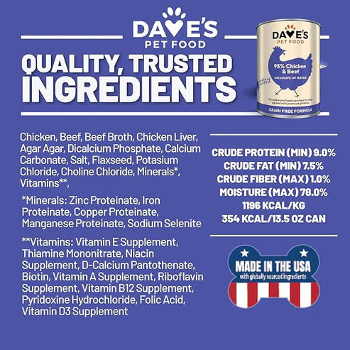 Designed as a complete and balanced meal, Dave’s 95% Premium Meats recipes are a more affordable, but equally beneficial alternative to a raw diet. Packed with just premium-protein Chicken & Beef, vitamins, minerals, and water, it’s an especially effective approach to feeding overweight dogs and dogs with diabetes. Try it alone, as a meal, or as to complement their kibble.