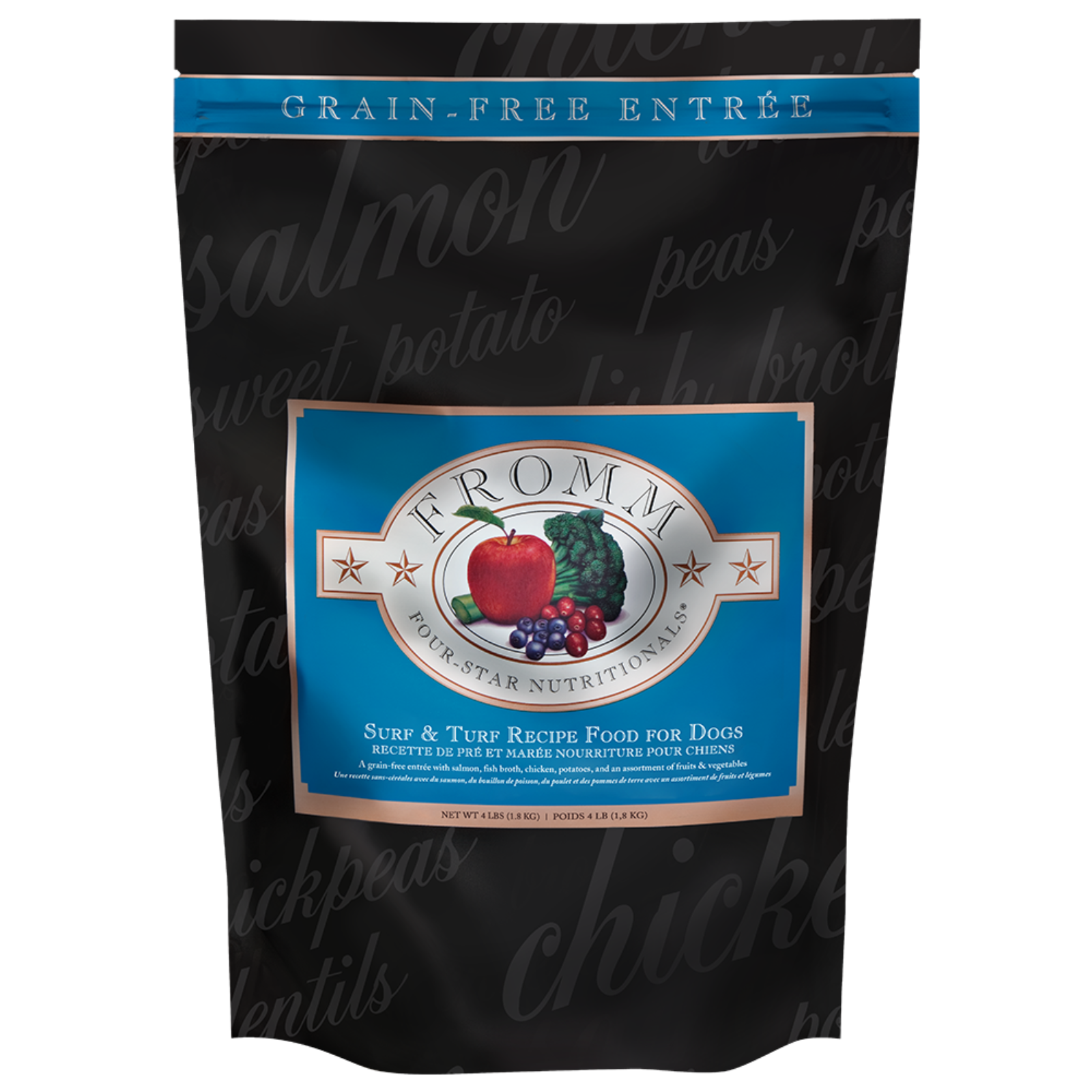 A grain-free entrée with salmon, fish broth, chicken, potatoes, and an assortment of fruits & vegetables
