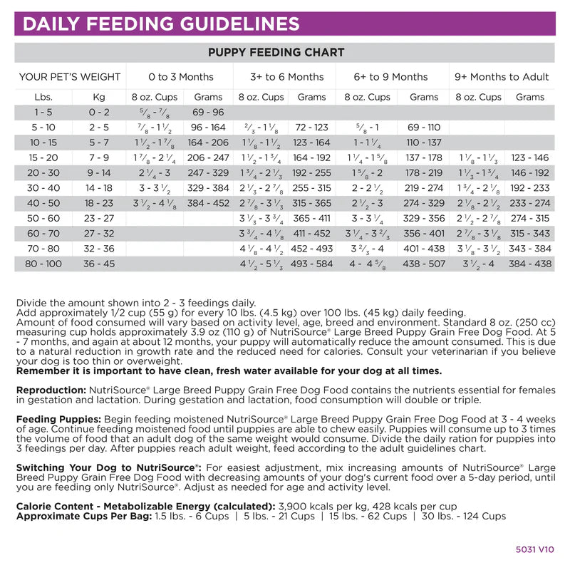 NutriSource® Grain Free Large Breed Puppy is ideal for breeds that mature at more than 50 lbs. NutriSource® Grain Free Large Breed puppy formulas deliver super premium nutrition in a holistically formulated, easy-to-digest food for balanced muscular and skeletal growth in large and giant breeds. Our large breed meals are created specifically for bigger dogs, utilizing adjusted levels of calcium and phosphorus matched with balanced protein, fat, carbohydrates, and calories to supply large breed puppies the nutrition to grow and develop your new pup to its fullest potential. We combine humanely certified turkey, North American red lentils, low-ash whitefish meal and carefully selected holistic ingredients to promote unparalleled health for your large breed pup. Health of your beloved pet is our #1 priority and our unmatched use of Good 4 Life supplements guarantees the new addition to your family won't have any runny stool issues and a healthier immune system, we guarantee it. Bio-availability is important to your pets long-term health so we created a larger-size morsel making it easier for large dogs to eat with a +85% digestibility rating - Health begins here!