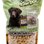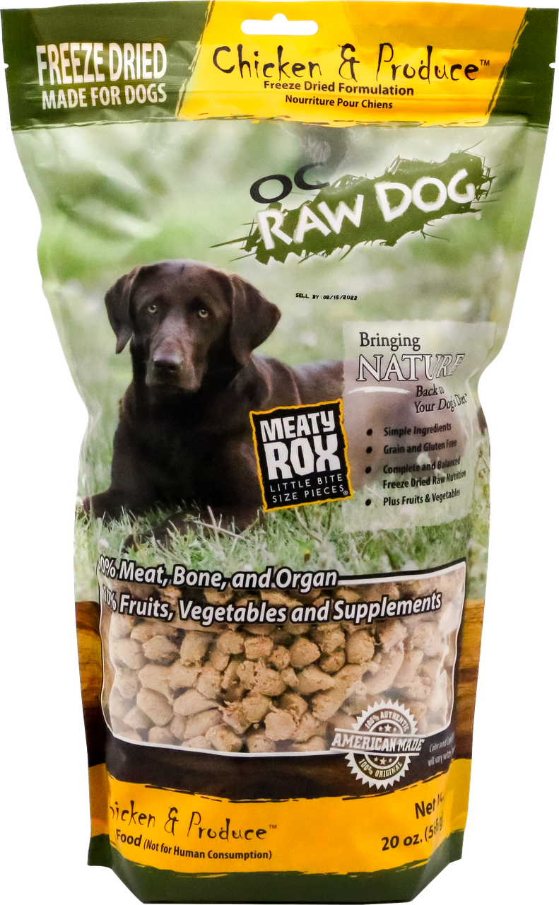 OC Raw Meaty Rox Chicken & Produce features 90% chicken meat, bone and organs, gently freeze dried into bite sized morsels that can be used as a food, treat, training tool or as a complete diet.