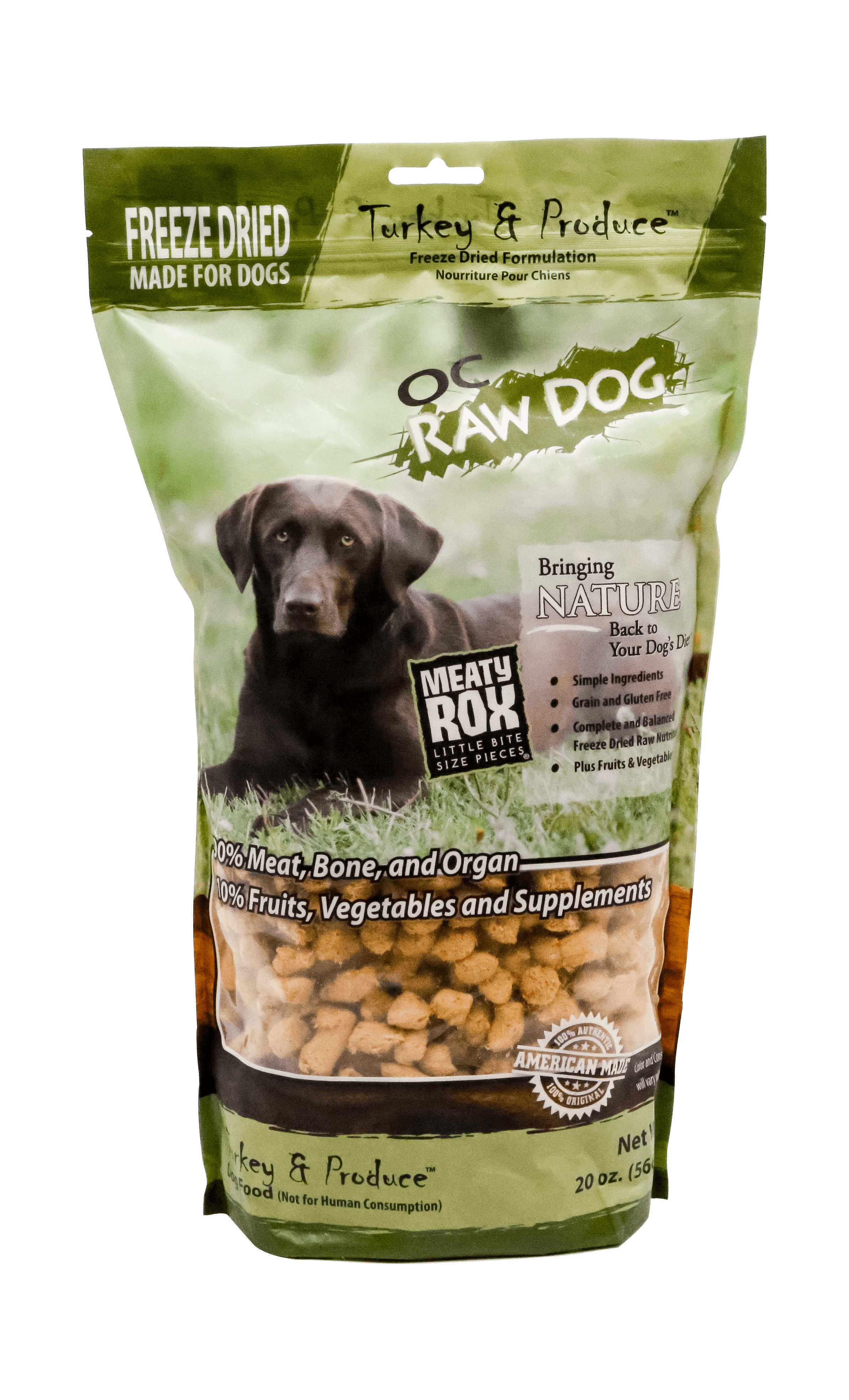 OC Raw Turkey & Produce Meaty Rox features 90% turkey meat, bone and organs, gently freeze dried into bite sized morsels that can be used as a food, treat, training tool or as a complete diet.