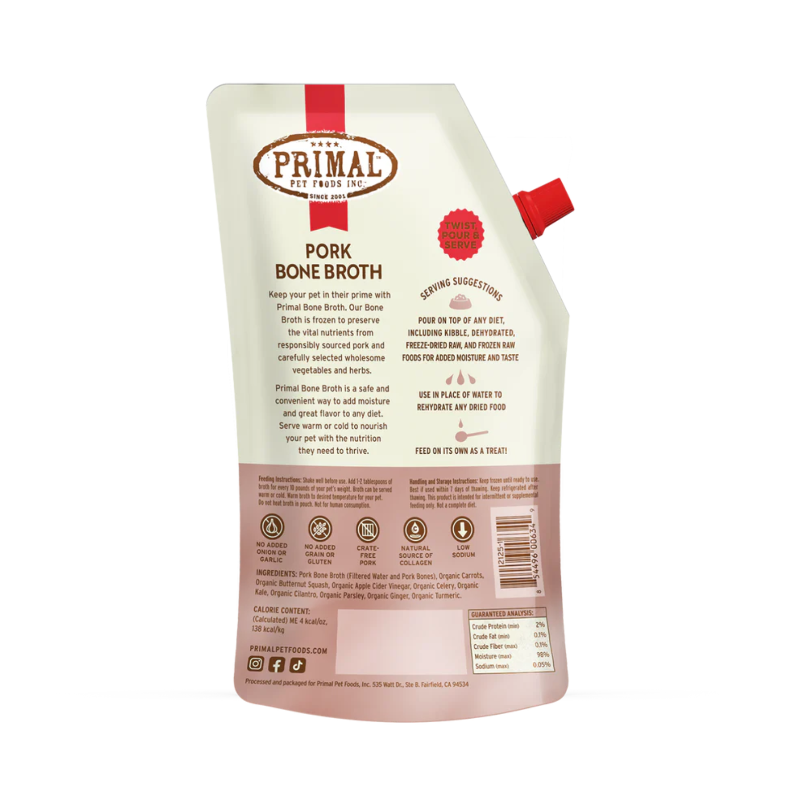 Bone Broth is a wholesome addition to any feeding regimen. When served on its own, added to commercial pet food, or along with any complete, balanced Primal Formula, Bone Broth adds necessary moisture and beneficial nutrients into your pet’s diet. With key benefits including digestion and liver support, hydration and moisture, joint health, and more, supplementing with Bone Broth is an easy way to keep your pet hydrated and healthy. Primal Bone Broth is appropriate for dogs and cats at all stages of life.