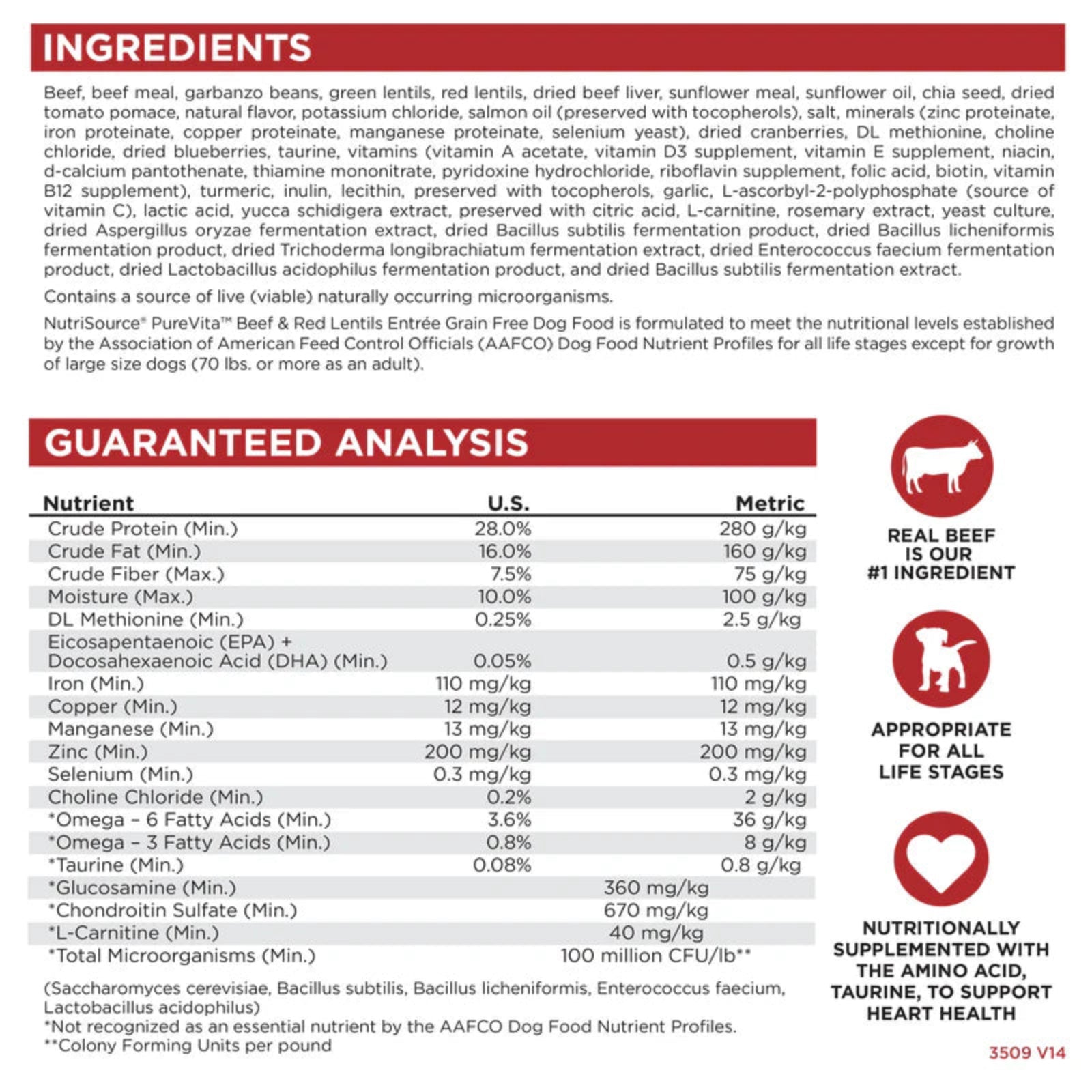 PureVita Grain Free Beef and Red Lentils Formula combines tasty beef with wholesome red lentils as well as a select variety of fruits to deliver a healthy and delicious, easy to digest meal your dog will love. And because it is made by NutriSource® you can be sure that it is formulated and produced with care using the finest quality ingredients from our family to yours.