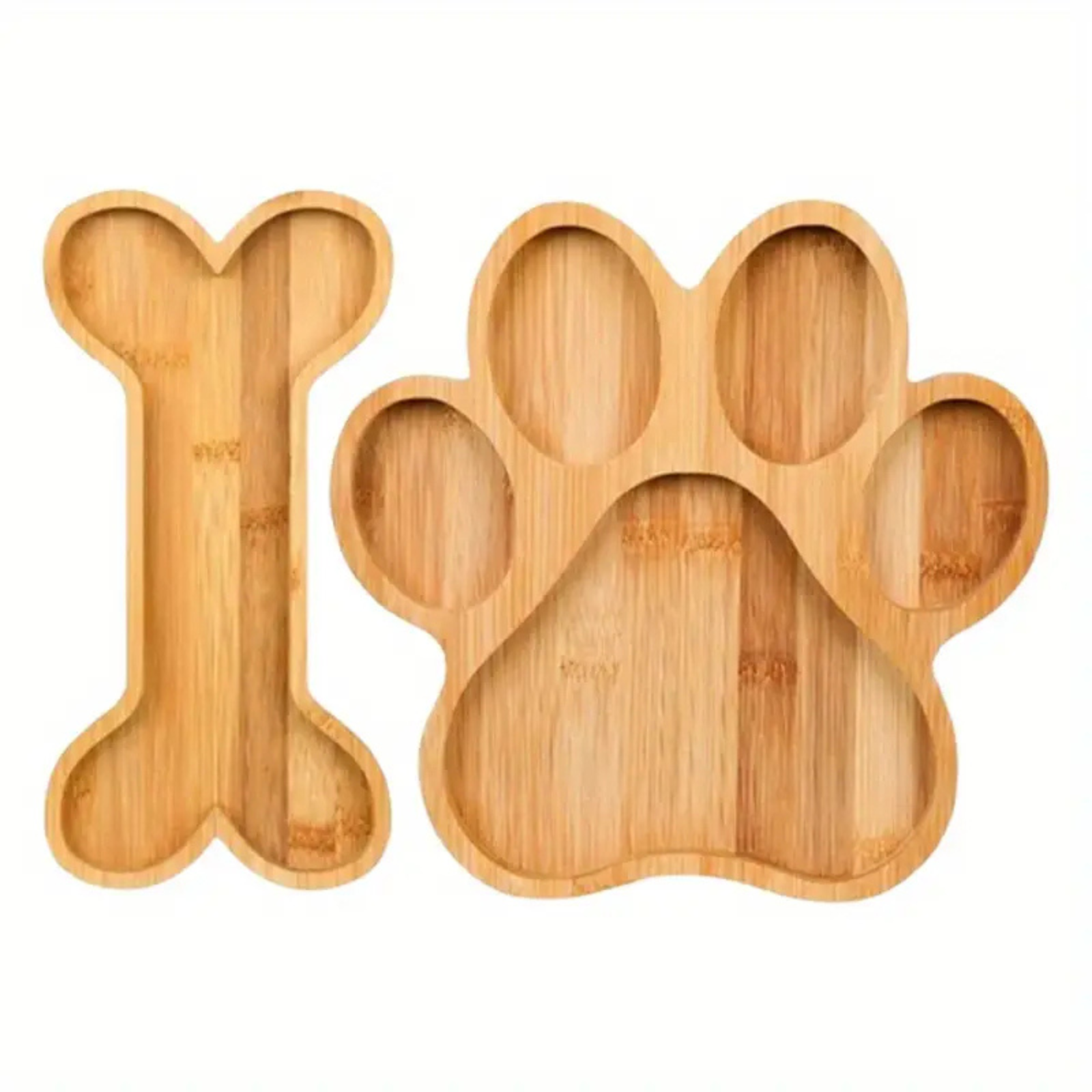 This natural bamboo charcuterie ("barcuterie") board features smooth, shallow compartments great for displaying treats and food in a fun, engaging manner. Great for parties, or for a fun mealtime experience! These boards come in two styles: paw-shaped or bone-shaped.