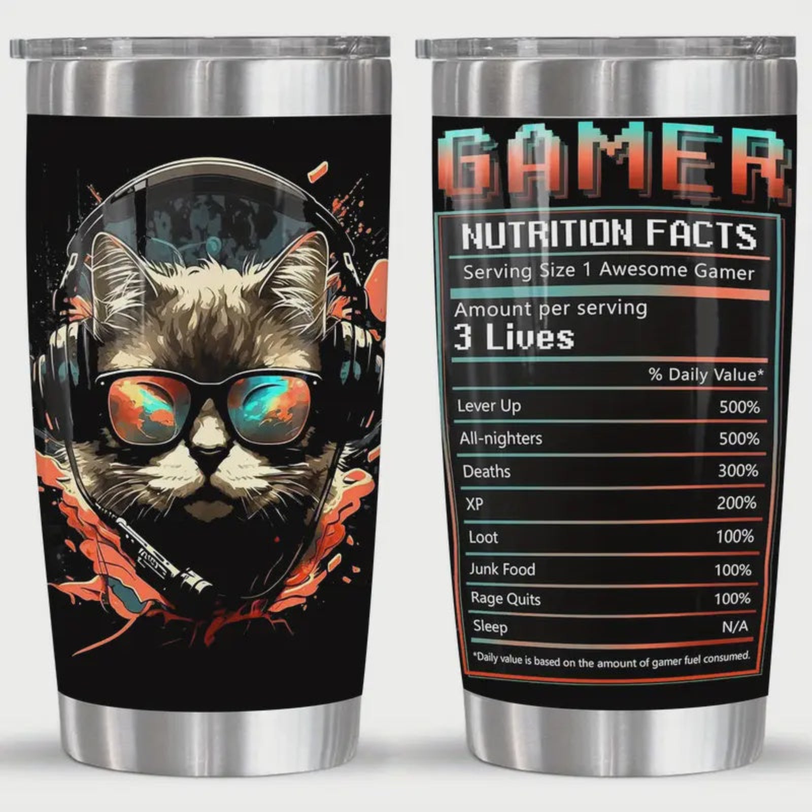 Level up your hydration game with our Gamer Cat Black Tumbler. This 20oz tumbler features a cool cat gamer design and comes with a lid to keep your drink secure on-the-go. Perfect for caffeinating your gaming sessions!