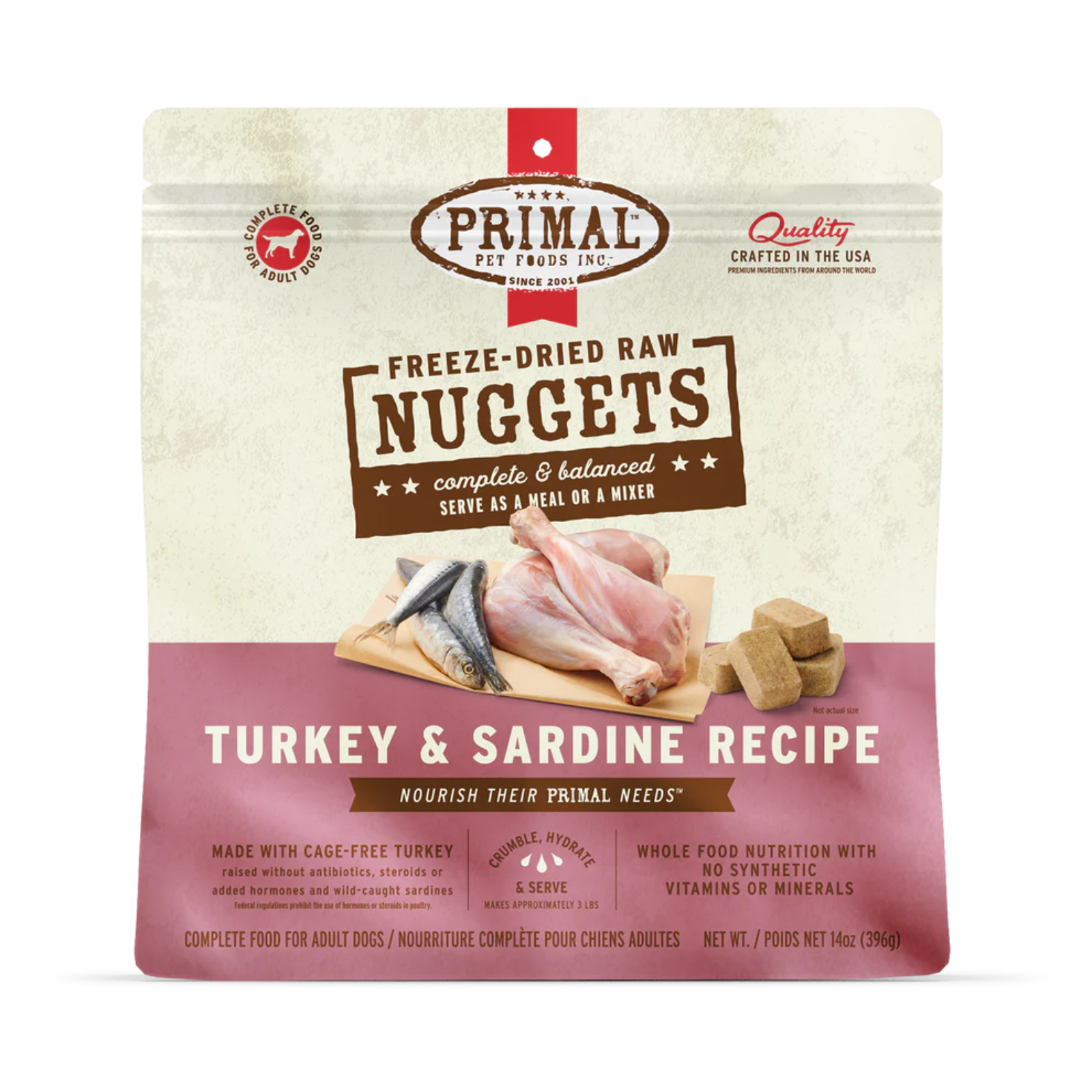 It’s easy to feed your dog real, whole foods that deliver optimal nutrition and digestibility with Primal Freeze-Dried Raw Nuggets. Our Turkey & Sardine Recipe freeze-dried raw dog food is free from synthetic vitamins and minerals and is made with cage-free turkey raised without antibiotics, steroids, or added hormones and wild-caught sardines. Simply crumble, hydrate with warm water, and serve!