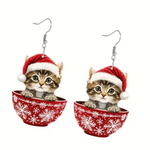 Tabby Cat Holiday Teacup Dangle Earrings