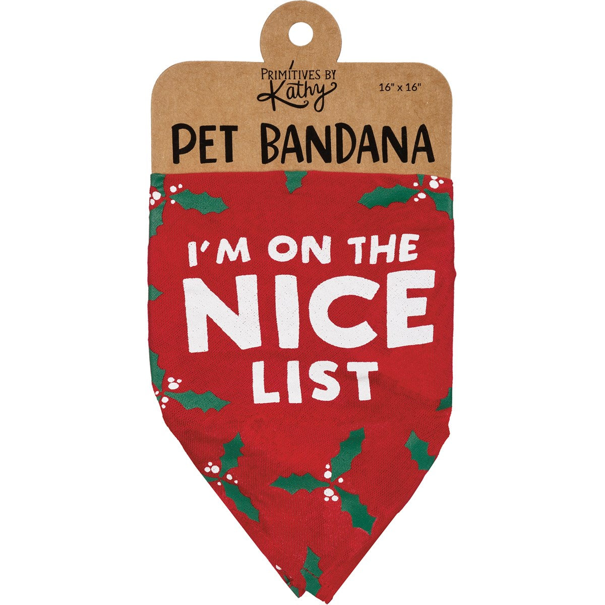 A small, reversible rayon pet bandana featuring an "I'm On The Nice List" sentiment on one side, and "I'm On The Naughty List" on the other, with all-over holly designs. Machine-washable.