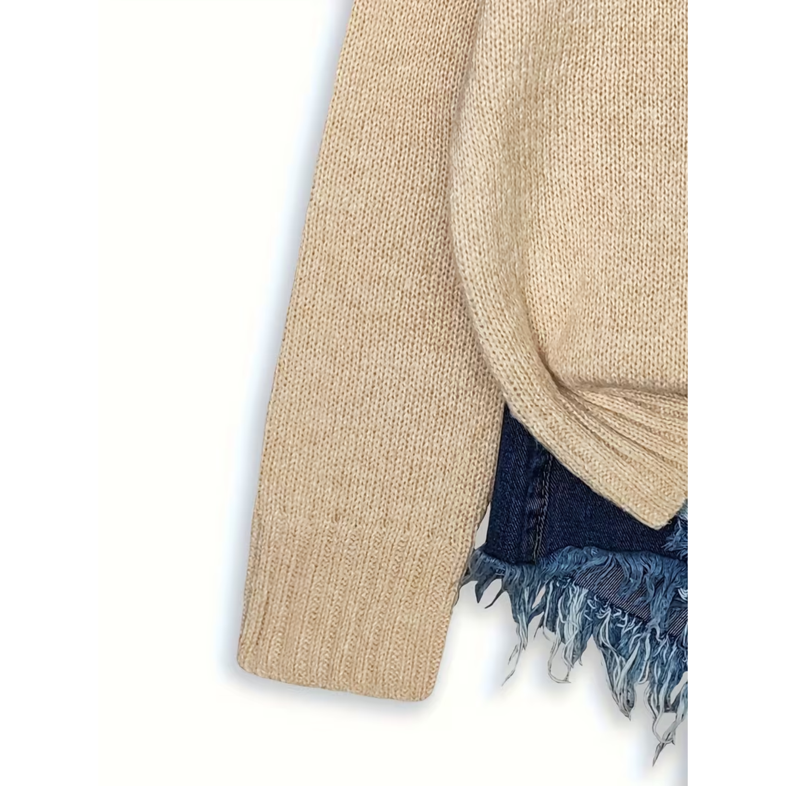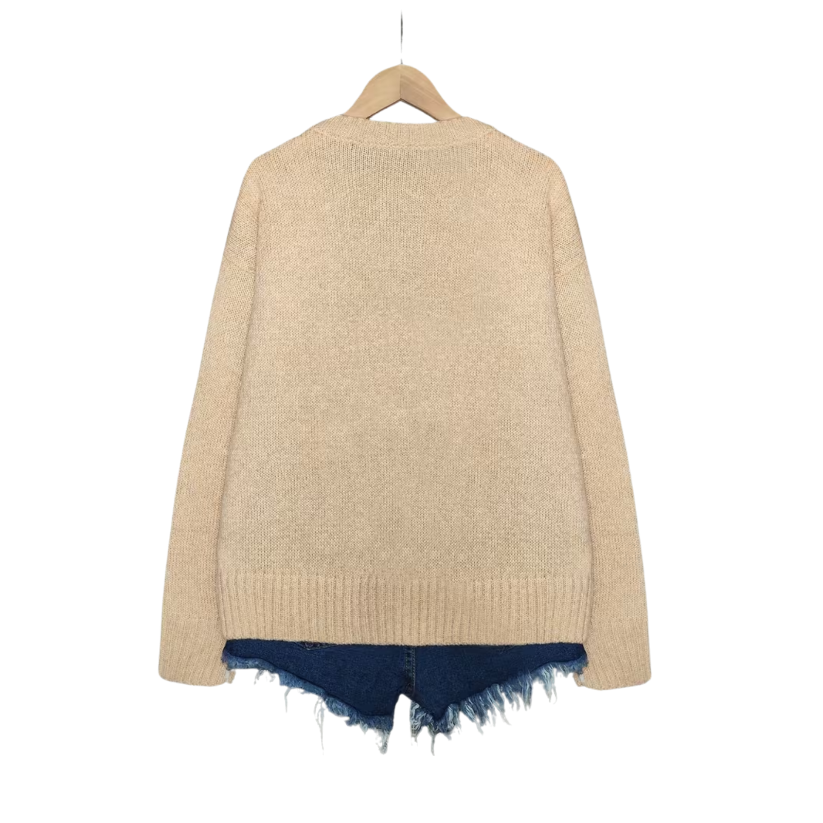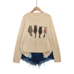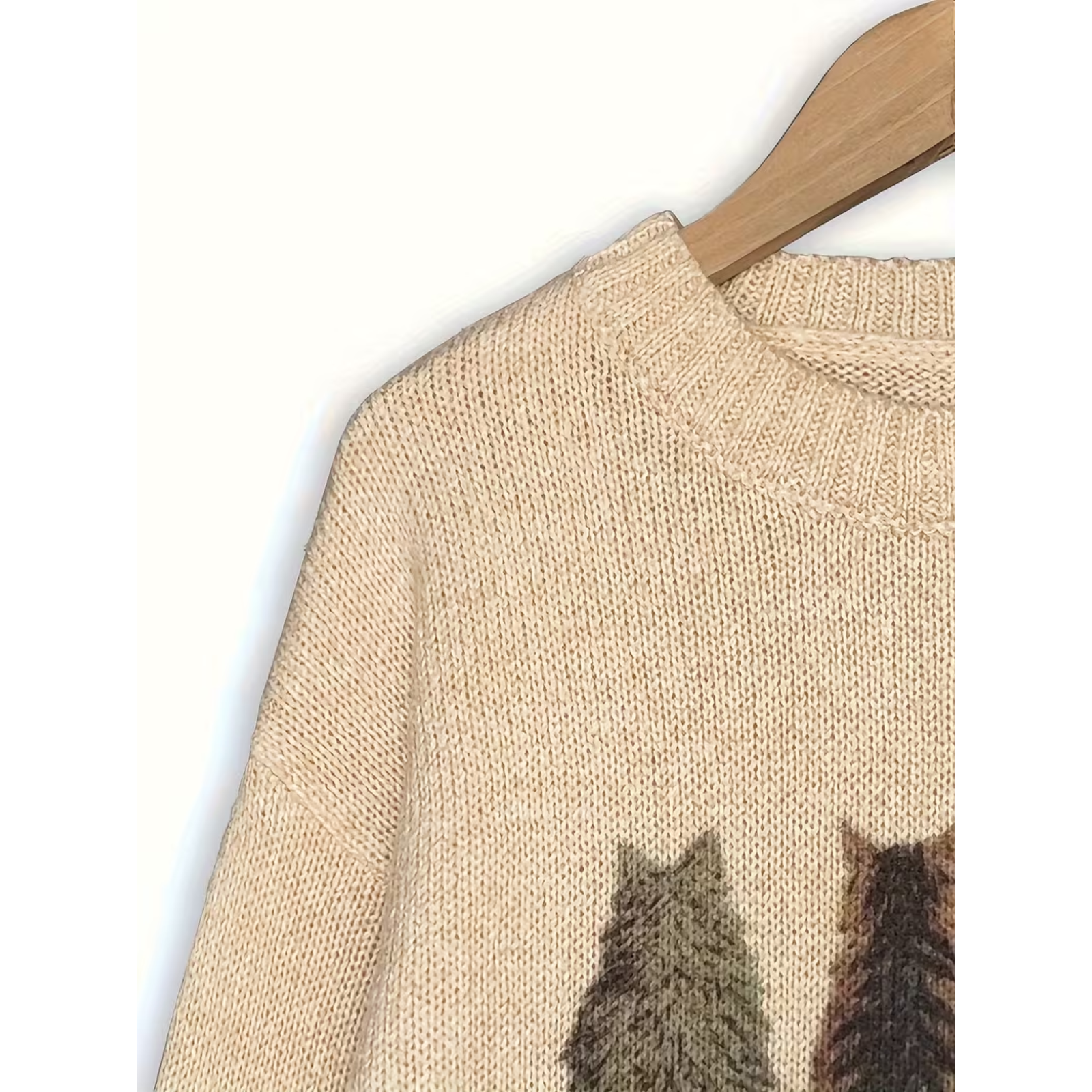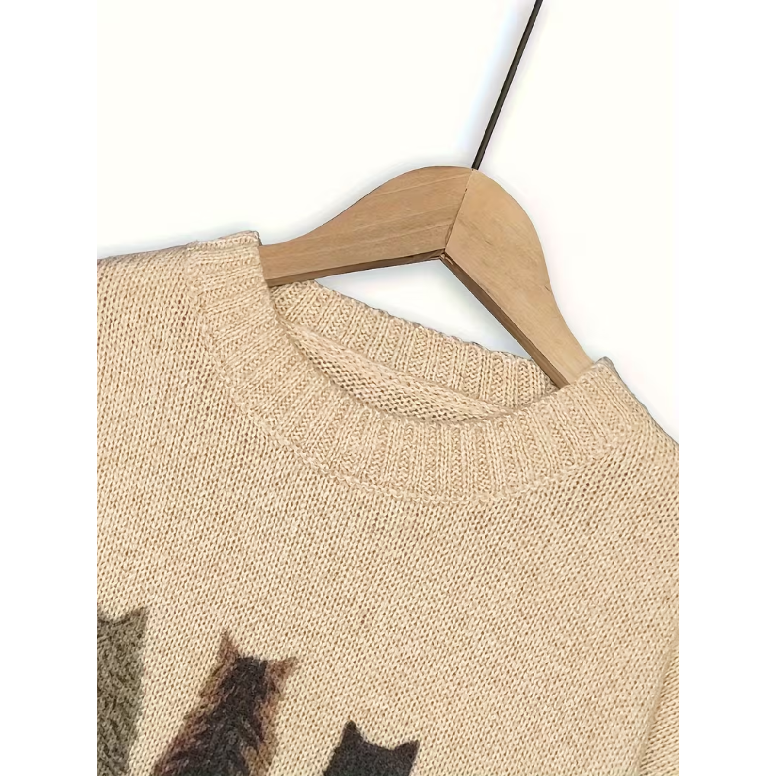 Stay cozy and charming this fall and winter with the Four Cats in a Row Beige Sweater. Crafted from soft polyester knit, this loose-fit sweater features a playful cat print in beige and brown tones, perfect for casual days. Its round crew neck and long sleeves offer comfortable warmth, while the mid-elastic fabric ensures easy movement. Easy to care for with hand wash or dry clean, this sweater adds a fun, feline flair to your seasonal wardrobe.
