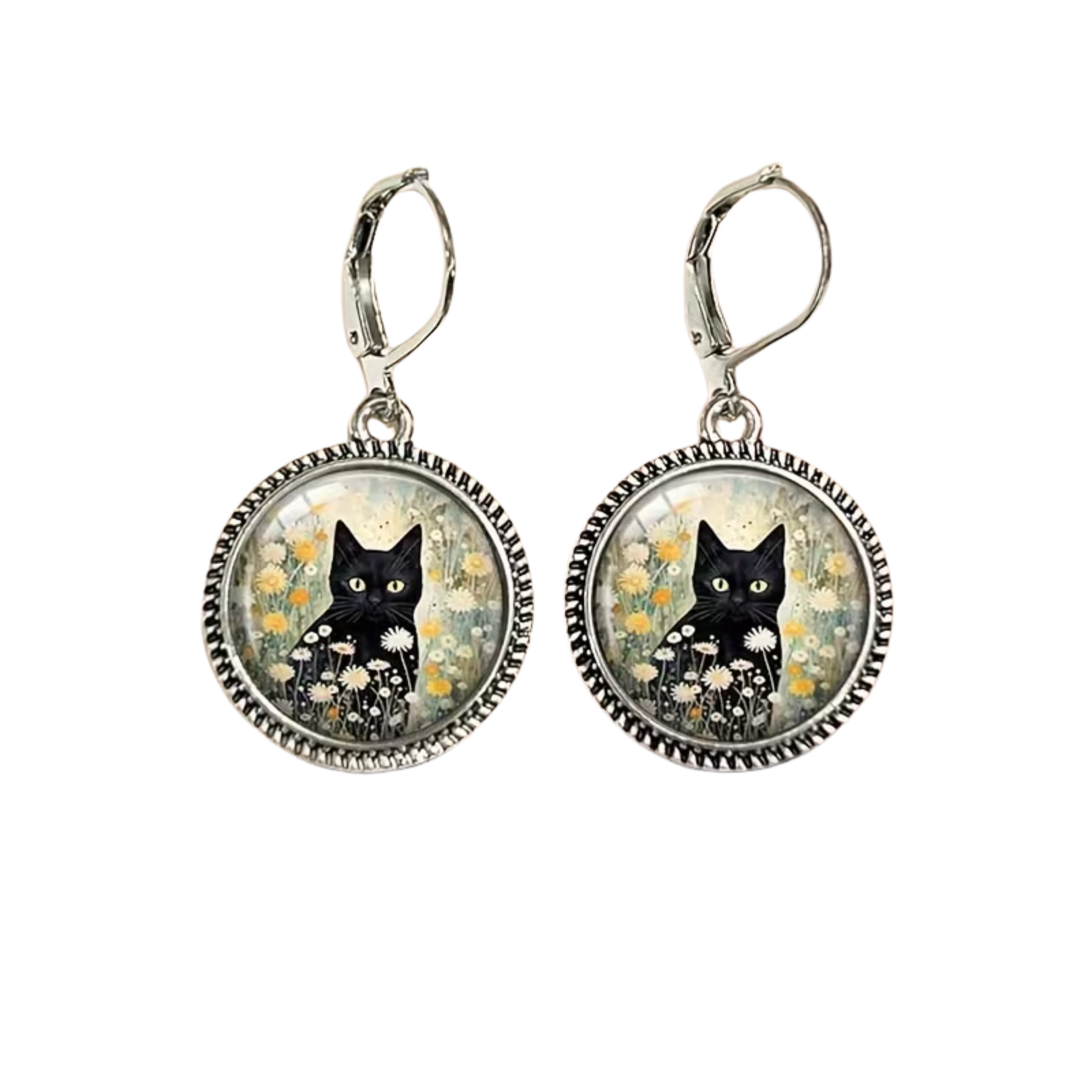 Black Cat & White Daisies Dangle Earrings