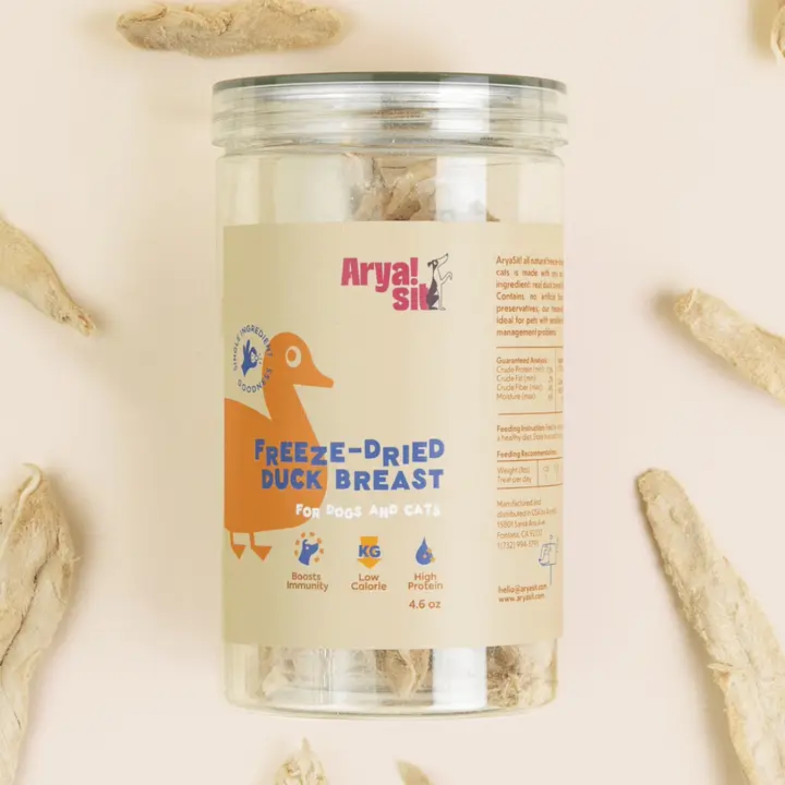 Arya Sit! all-natural freeze-dried treat for dogs and cats is made with a single ingredient and contains no artificial flavors, sweeteners, grains, or preservatives. Our freeze-dried duck breast is ideal for pets with sensitive stomachs and weight management problems. You can feel confident knowing your pet is getting a nutritious snack.