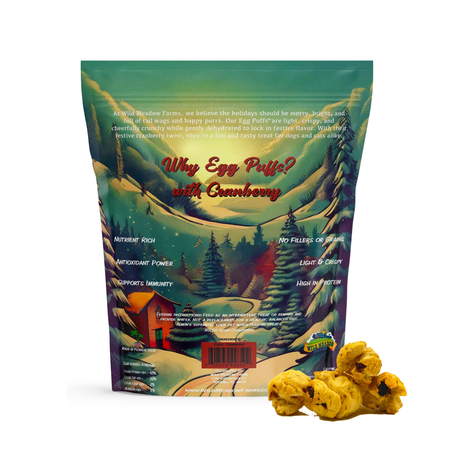 Our seasonal Puffs are perfect addition to the holiday festivities. Using our unique Egg Puff treats we are offering a special recipe with Cranberry. They're a fun tasty treat for dogs and cats like.