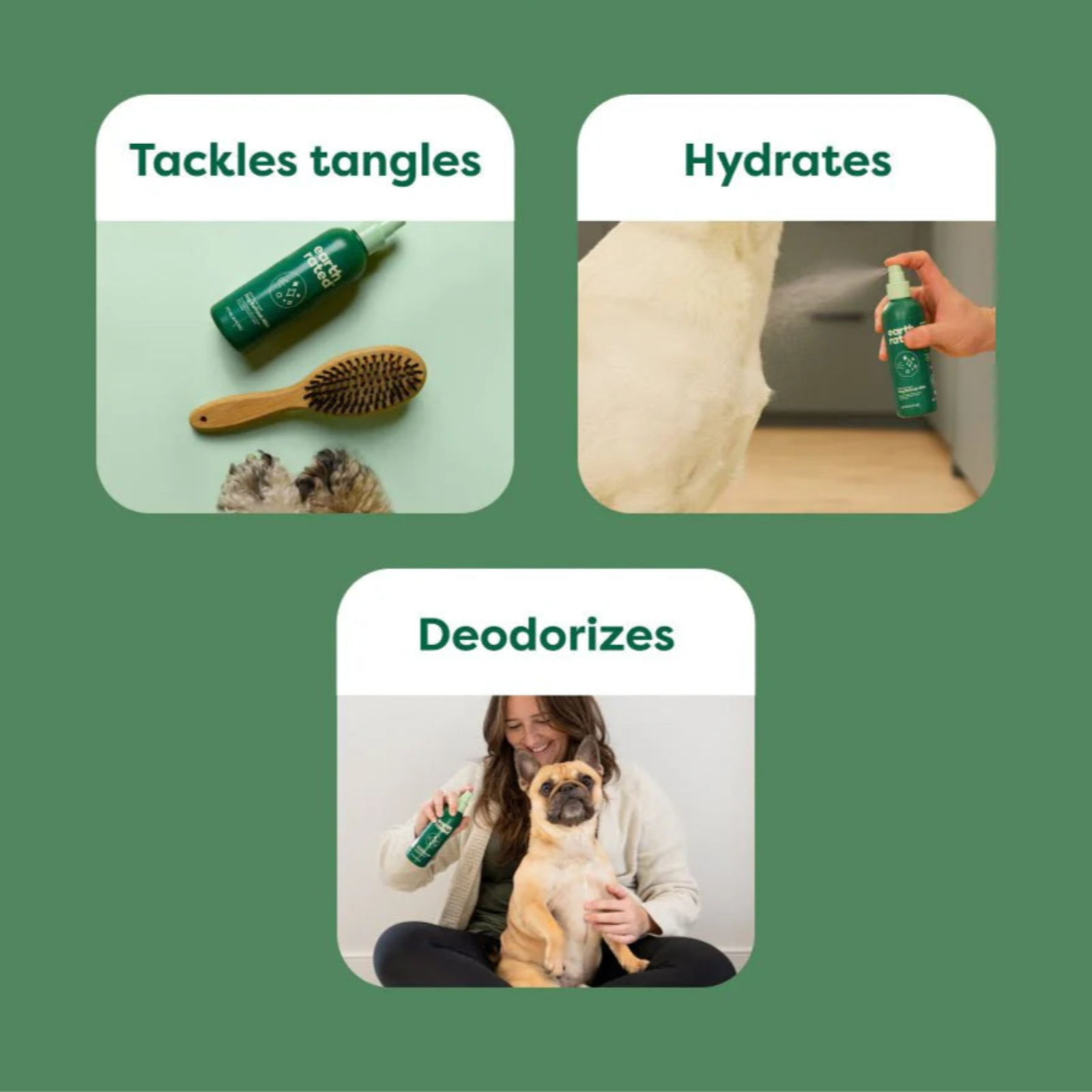 A triple-action dog deodorizing spray that hydrates, eliminates odor, and helps tackle tangles.