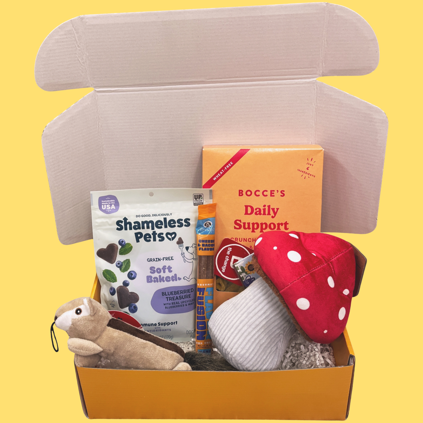 Each box will deliver 2 Toys, 2 Packaged Treats and 1 Chew, all geared towards your pups gender, size and age! All of this at a savings of 30-50% off MSRP! Simply select the option that fits your pup! Select the Gender and the Age Range and we will curate one especially for you!