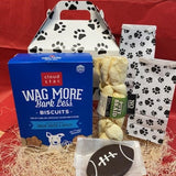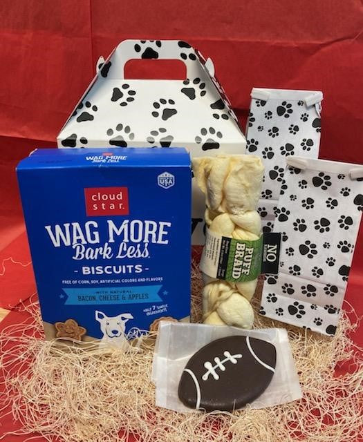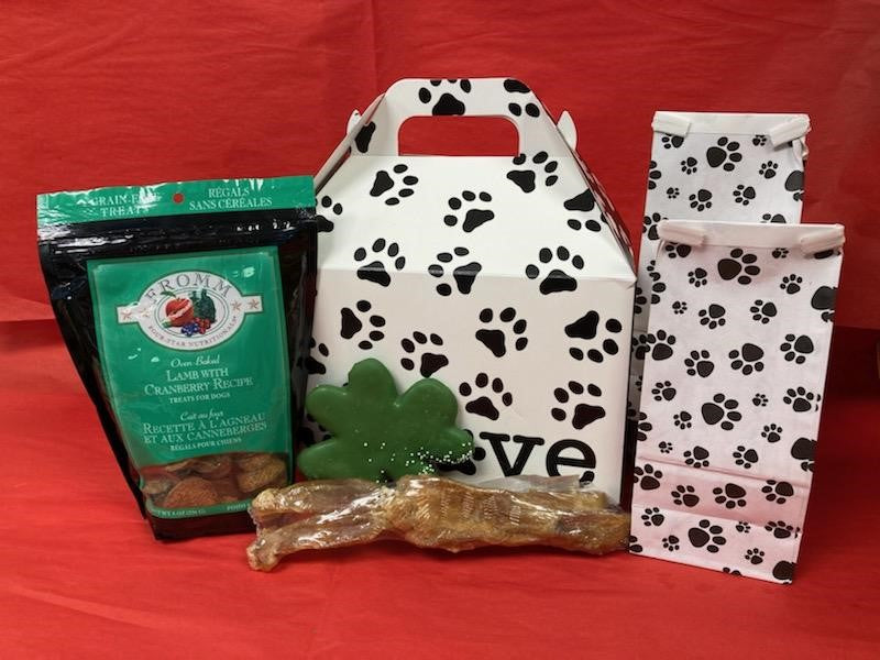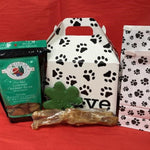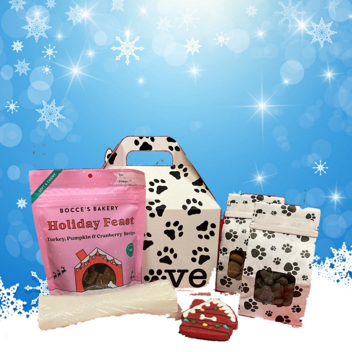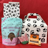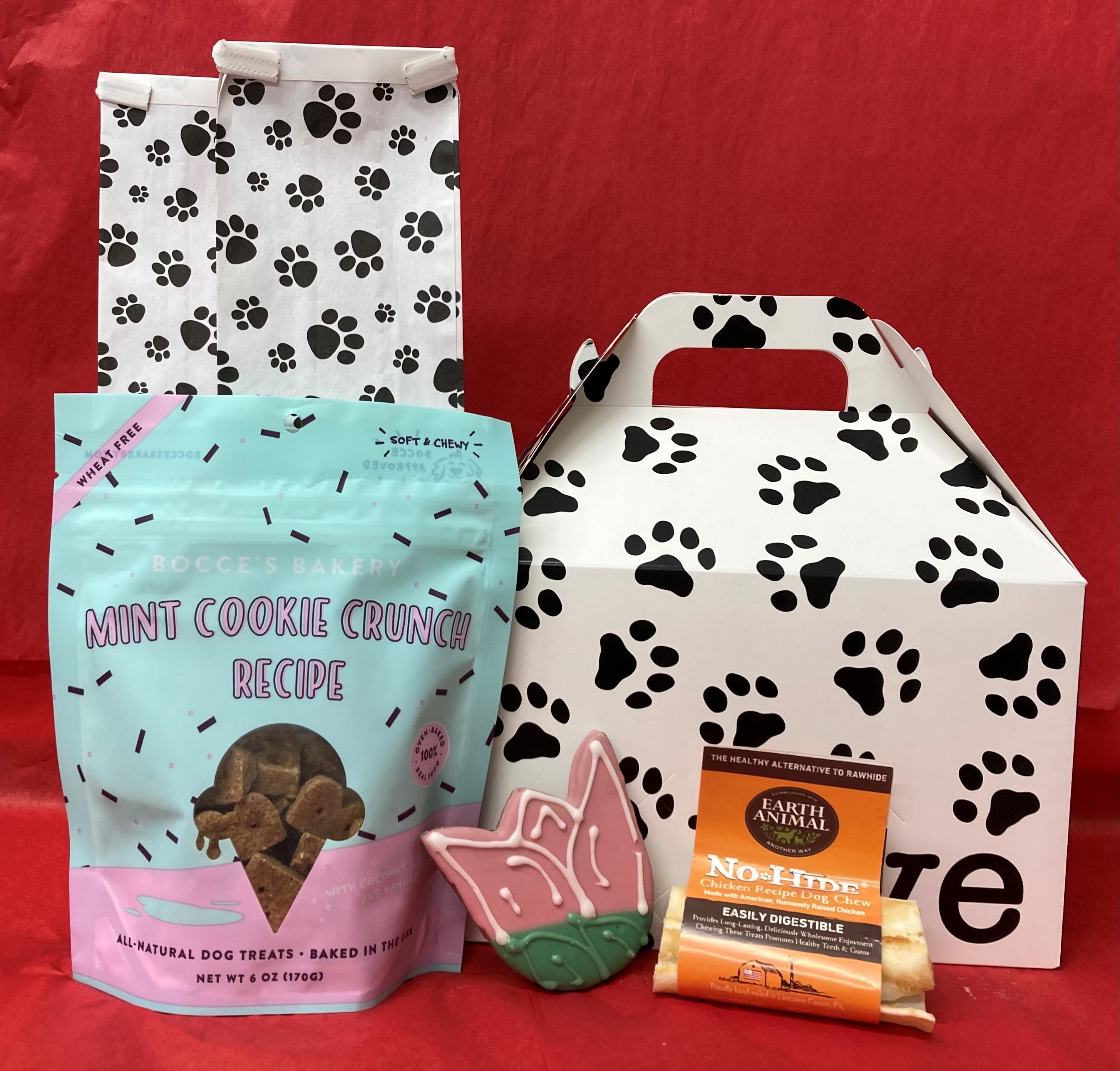 Each box will deliver an assortment of 2 Types of Healthy Bulk Treats from our Bulk Bar (a Half Pound Each), 1 Packaged Treat, 1 Chew, and 1 Seasonal Iced Cookie from our Barkery Case!