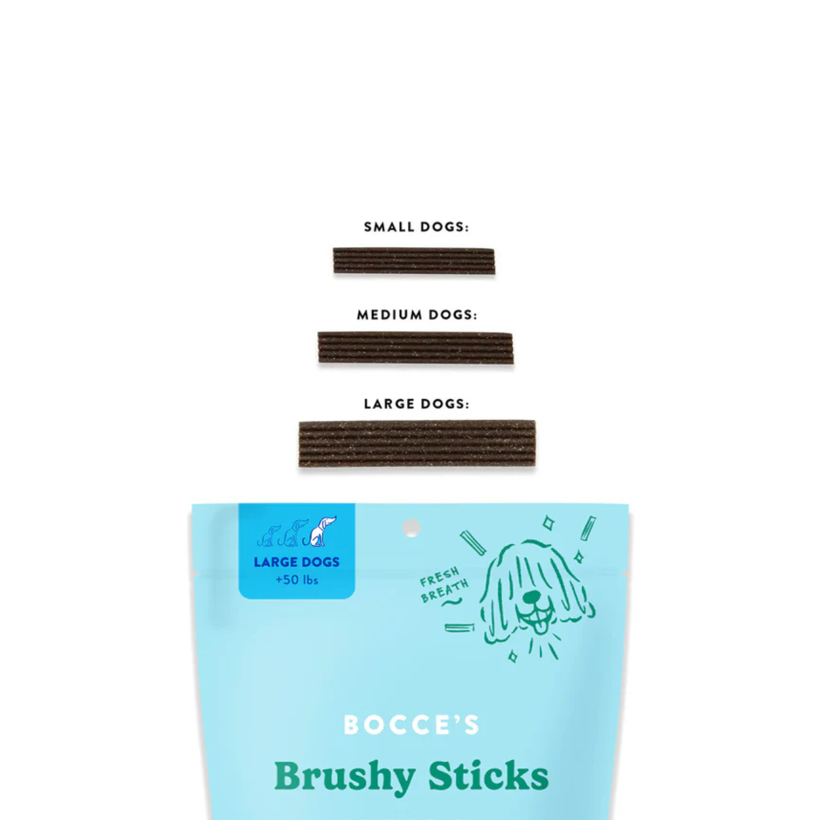 Feeding Instructions: Feed one Brushy Stick per day. Choose the appropriate size Brushy Stick for your dog based on their weight. Make sure fresh drinking water is available. Monitor your dog to ensure that they chew the treat - gulping or failing to chew can be harmful or even deadly.