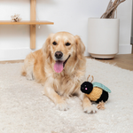 Made with cotton canvas, faux fur, spun recycled water bottle filling, a super loud squeaker, crazy crinkle paper, and tuggable jute rope, this playfully designed toy is sure to be quite the buzz during playtime.