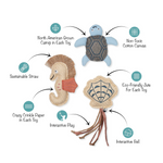Our “Vitamin Sea Buds” earth friendly 3 piece mini toy set is purrfect for the playful kitty. This set was designed with interactive play in mind and a look that complements modern home décor (and the planet!) using non-toxic cotton canvas, sustainable straw, jute fringe trim, spun recycled water bottle filling, North American grown catnip, crazy crinkle paper, raffia ribbons, and a silver bell. Your kitty will think these thoughtfully designed toys are turtle-y cool.