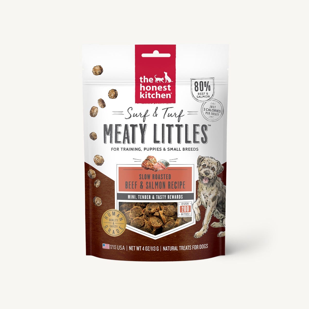 The Honest Kitchen believes the best way to get your pup to sit, stay or just behave is with super tasty, human grade treats! Our Surf & Turf Meaty Littles combine lots of ranch raised beef and wild caught salmon to deliver a super craveable taste with an extra helping of protein to support strong muscles and DHA for optimal brain health. Perfect for training, treating and toys, your pup will flip for these tender bits of goodness.