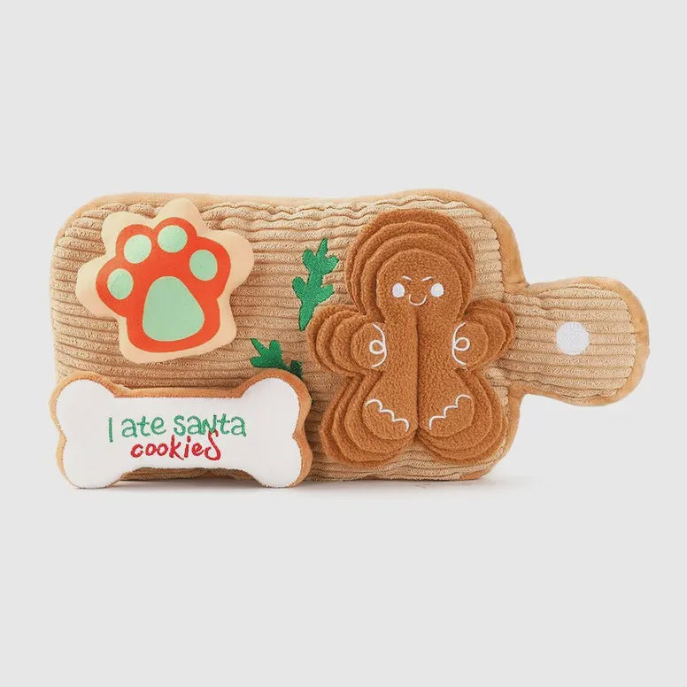 Who says cookies are just for Santa? This Cookie Board is a multi-part toy with two squeaky cookies and a mini gingerbread man snuffle mat, perfect for hiding tasty surprises. The two plush toys are removable and can be played as independent toys. The crinkly base adds extra fun, turning treat time into a jolly game of sniff and squeak. Watch your pup unwrap the holiday spirit with every play session!