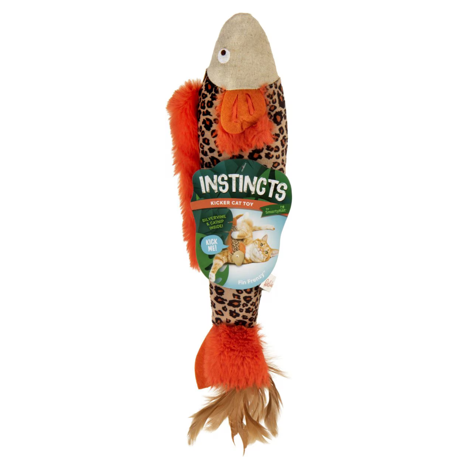 The Instincts Fin Frenzy Crinkle Plush Kicker with HappyNip Silvervine & Catnip Cat Toy is purr-fectly sized to kick, wrestle and cuddle. Crinkle, feathers, felt and soft plush mimic the feel of prey. The irresistible crinkle sound mimics prey rustling in bushes, while the plush is paw-some for carrying. Enticing feathers and faux fur encourage your kitty to swat. The toy even contains silvervine and catnip for extra frisky play.