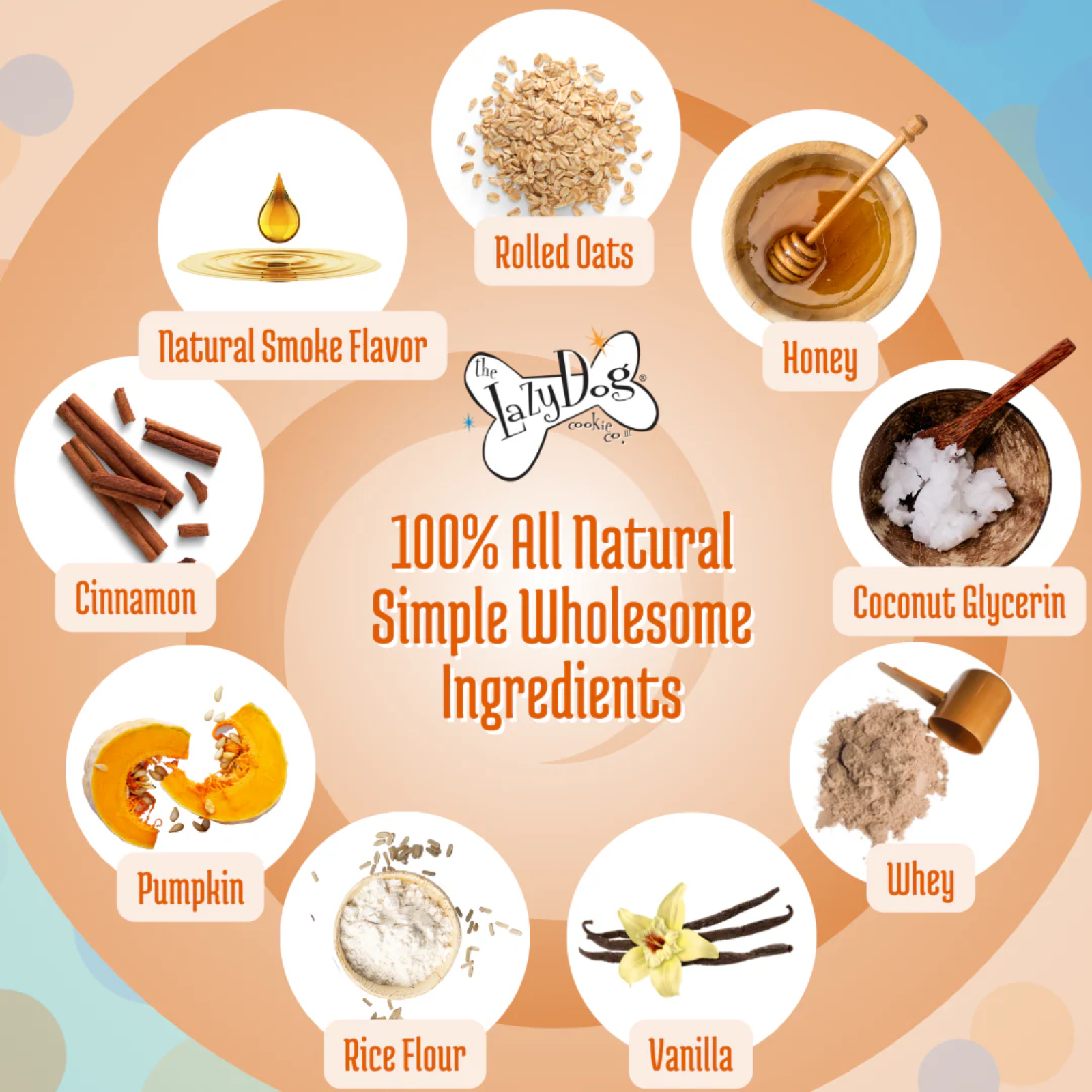 Rolled Oats, Honey, Coconut Glycerin, Whey, Vanilla, Rice Flour, Pumpkin, Cinnamon, & Natural Smoke Flavor.