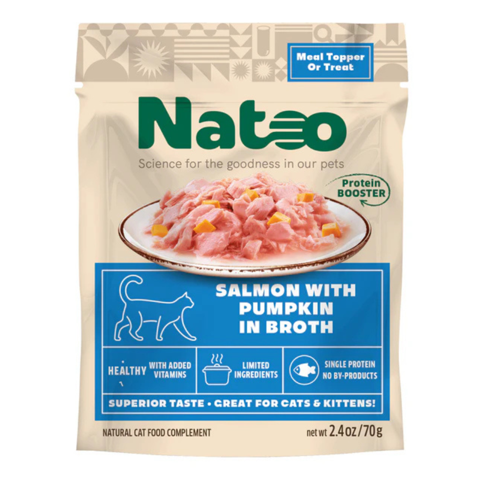Natoo Salmon with Pumpkin in Broth is formulated with clean, healthy ingredients cats naturally crave. Packed with protein and natural nutrients, this limited ingredient recipe is produced in our 100% solar-powered kitchens in sunny Brazil. As a mixer or topper, it makes dry kibble or freeze-dried food incredibly delicious. Or serve it on its own as a delectable, highly digestible treat. Tender pieces of premium salmon and pumpkin are served in a succulent broth to help provide your customers' furry companions with the vital hydration felines need. This product should be served as a meal topper or a treat and is intended for intermittent or supplemental feeding only.