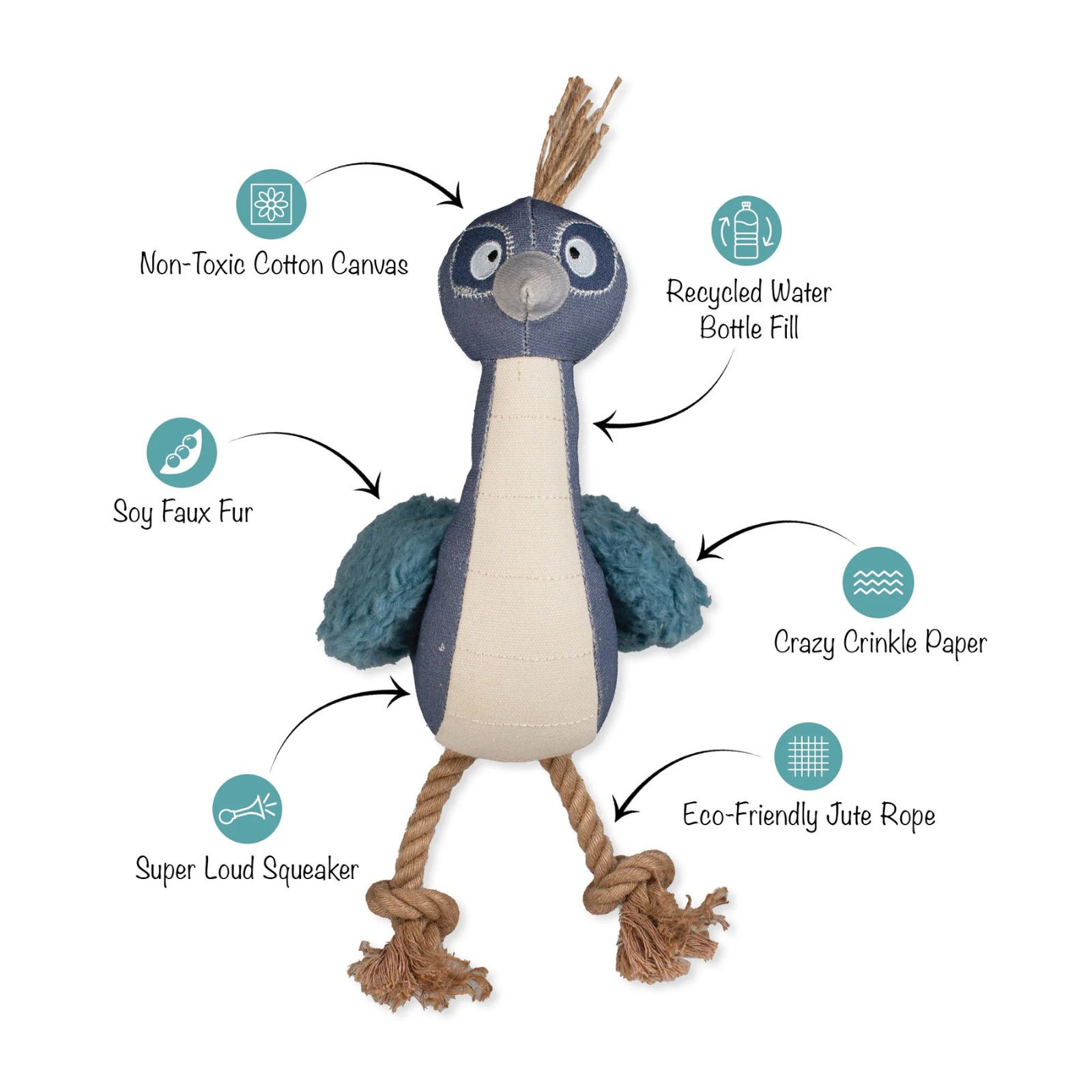Our "Feather Than Ever” earth friendly dog toy is the perfect playdate for your pup. This toy was designed with interactive play in mind and a look that complements modern home décor (and the planet!) using non-toxic canvas, soy faux fur, spun recycled water bottle filling, a super loud squeaker, crazy crinkle paper, and tuggable jute rope. Whether you squeak, crinkle, tug, or toss it, this eco-friendly toy will make playtime blue-tiful.