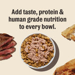 Take their meals from basic to bowl-licking-good with our 99% Meat Toppers for dogs, made with just 3–4 ingredients, including cage-free chicken, cage-free turkey & duck, ranch-raised beef or wild caught salmon with pollock. The meat of the matter? They’re protein-packed, grain-free and always 100% human grade.
