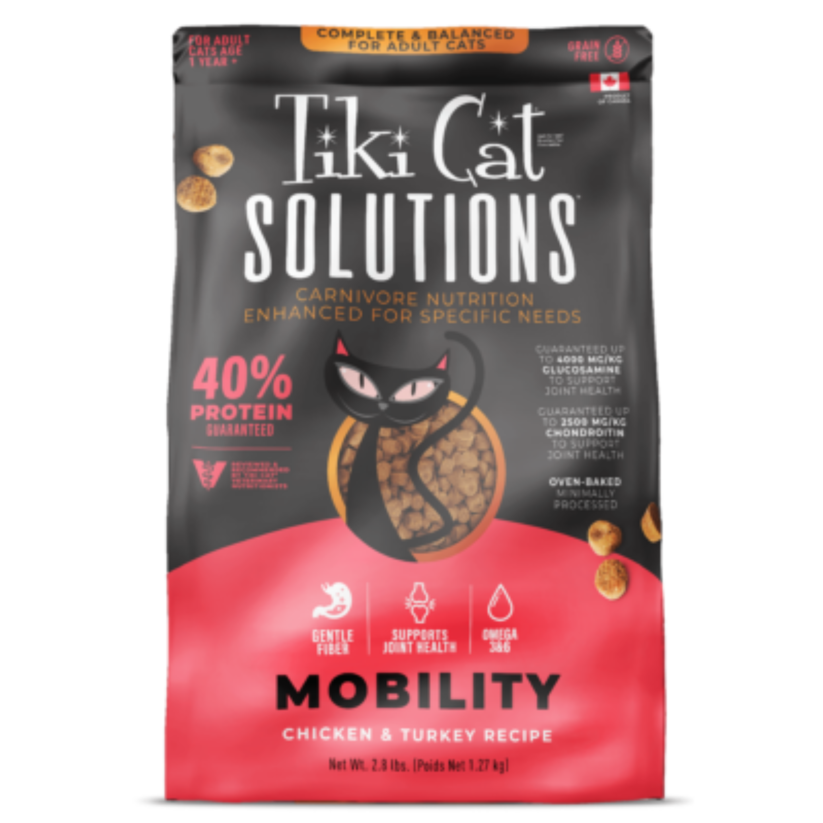 Supports Joint Health. Tiki Cat® Solutions™ Mobility Baked Kibble is protein-rich, with Glucosamine and Chondroitin to support healthy joints.