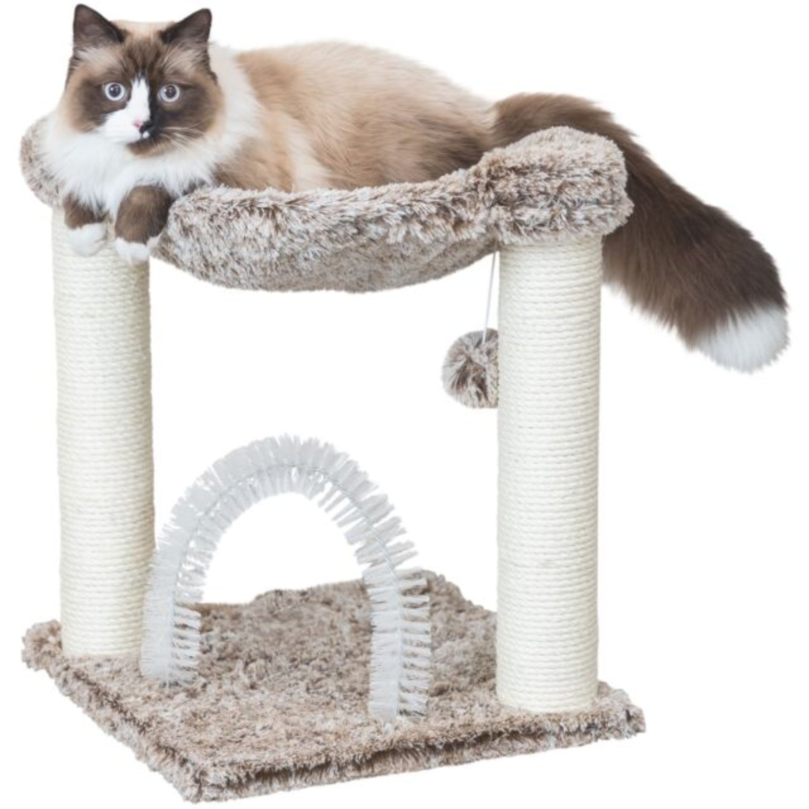 - A self-grooming arch made of flexible bristles attached to the base, allowing cats to brush themselves while walking through or rubbing against it.