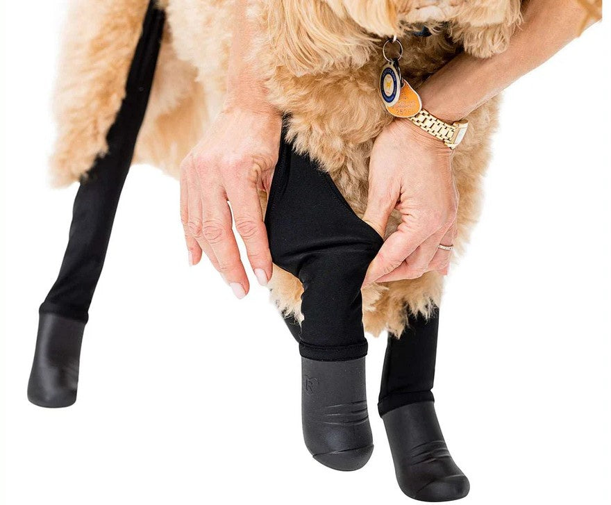 EASY ON ➞slide leggings over the back, insert legs, and paws slip into booties—far simpler than individual boots.